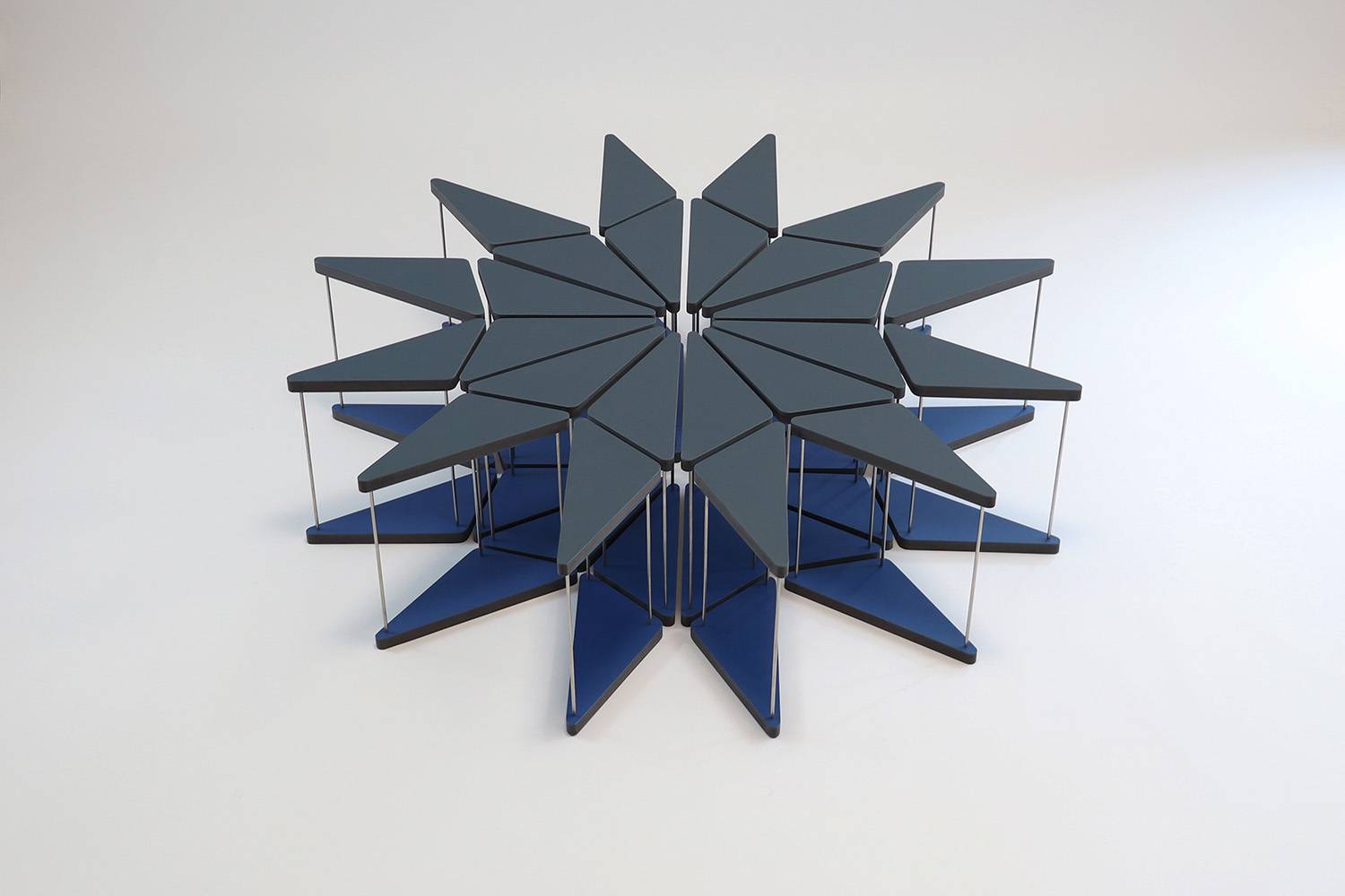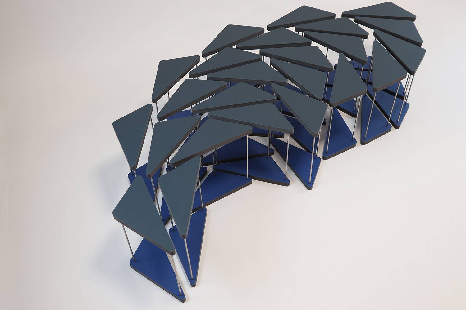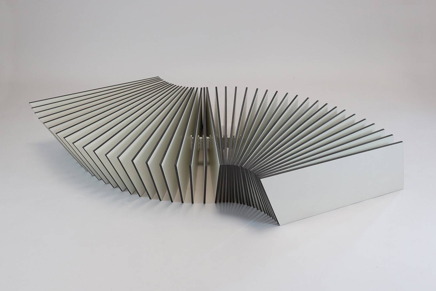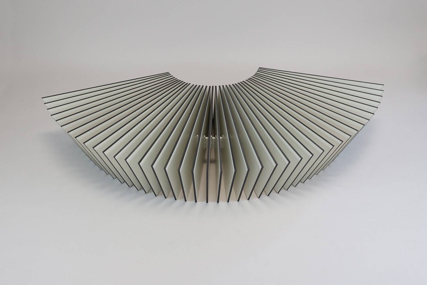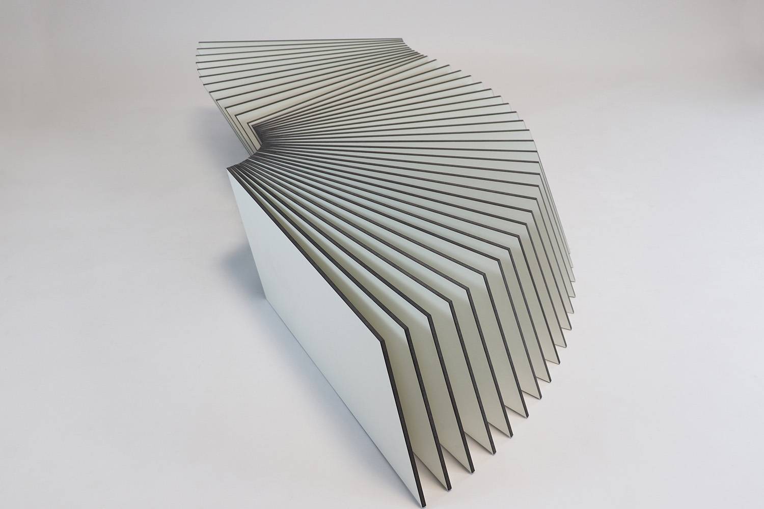 our favorite in the series. tabletop, table legs, carcass? all unnecessary. instead, this table is made of 40 vertical plates, each connected by a hinge. each plate can be rotated independently of the others. a thousand shapes are possible: from square to curved, even a circle. the highlight: elements can be added in any number. how long do you think the longest spine will be?