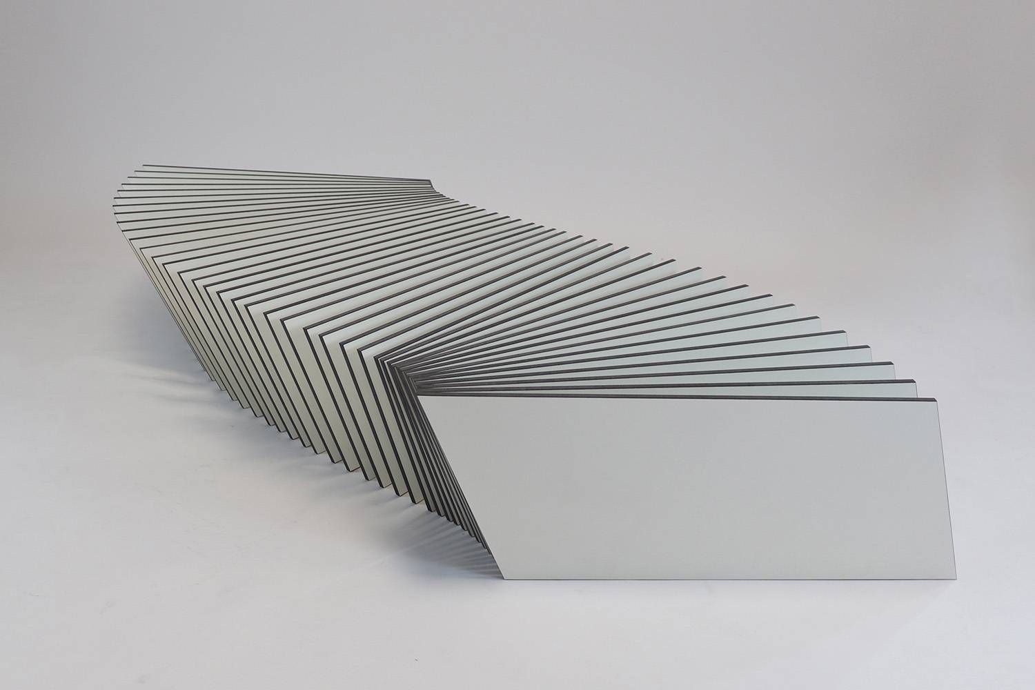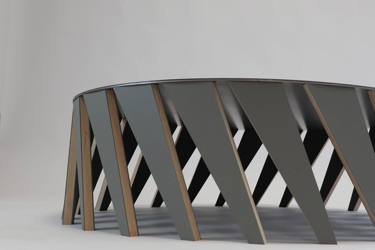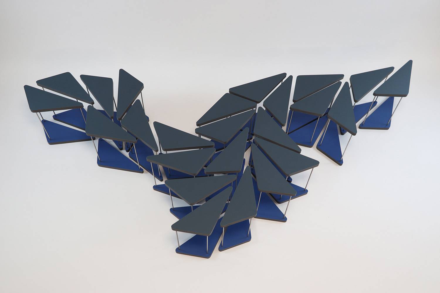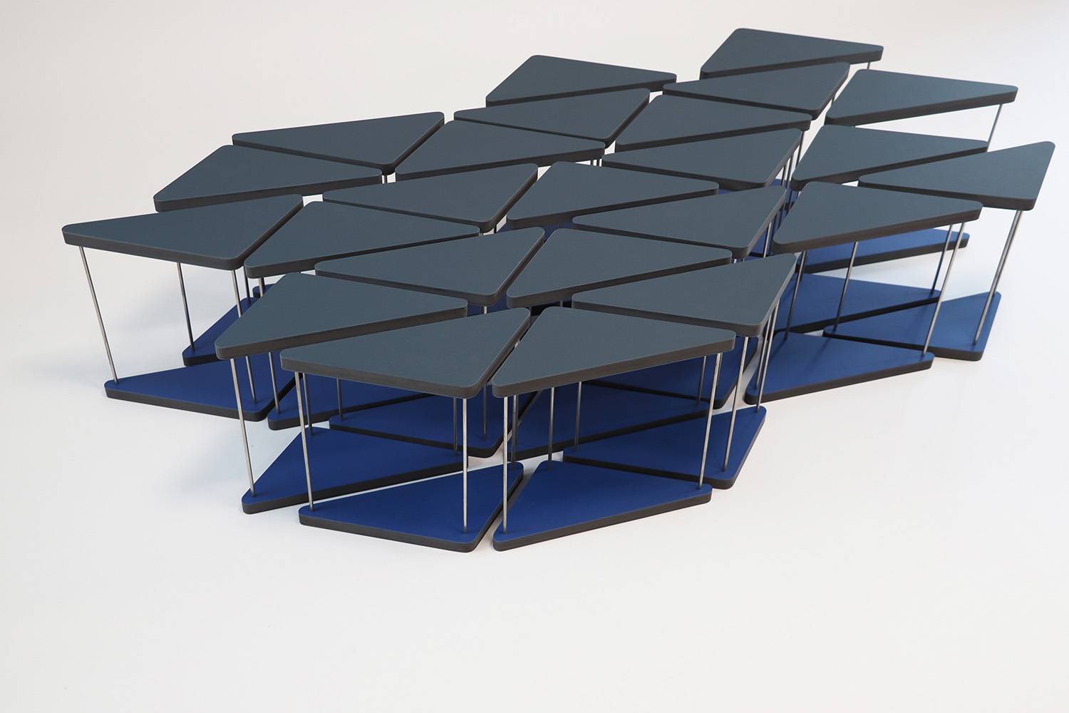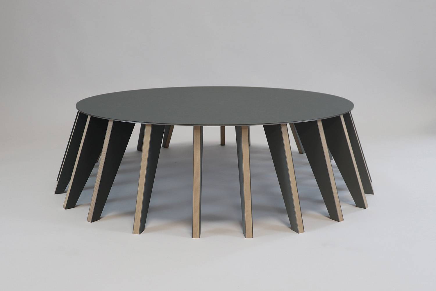 our favorite in the series. tabletop, table legs, carcass? all unnecessary. instead, this table is made of 40 vertical plates, each connected by a hinge. each plate can be rotated independently of the others. a thousand shapes are possible: from square to curved, even a circle. the highlight: elements can be added in any number. how long do you think the longest spine will be?