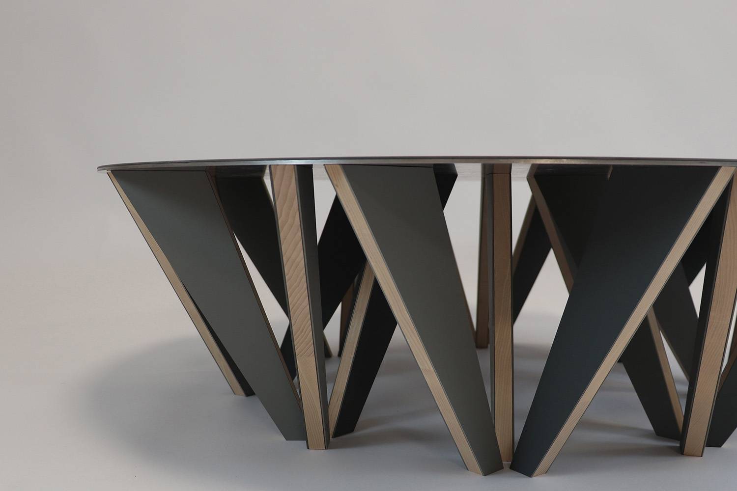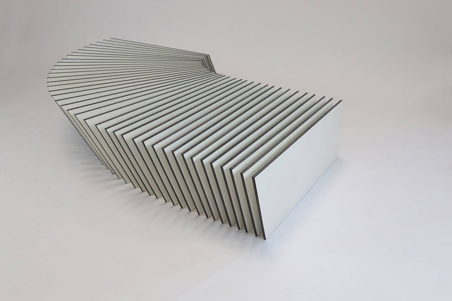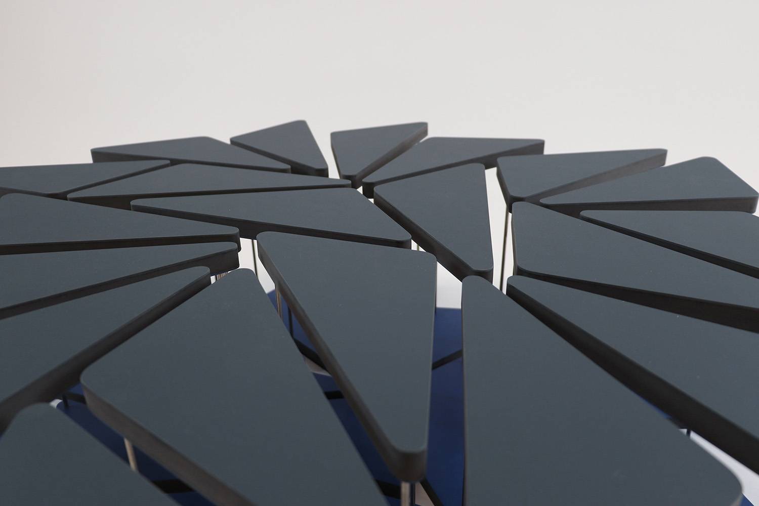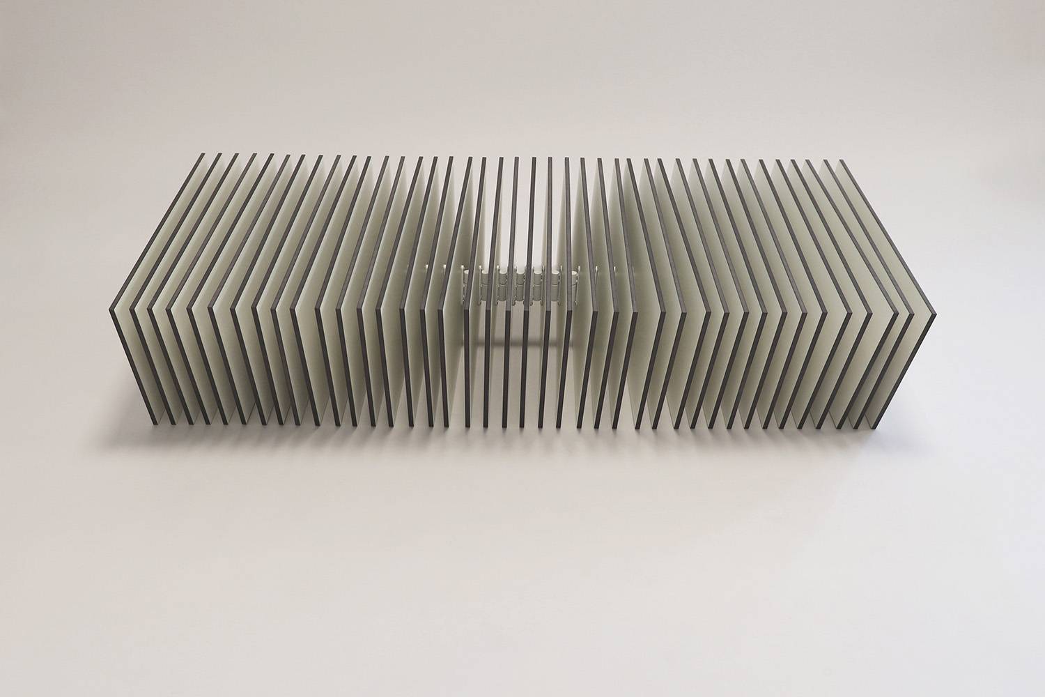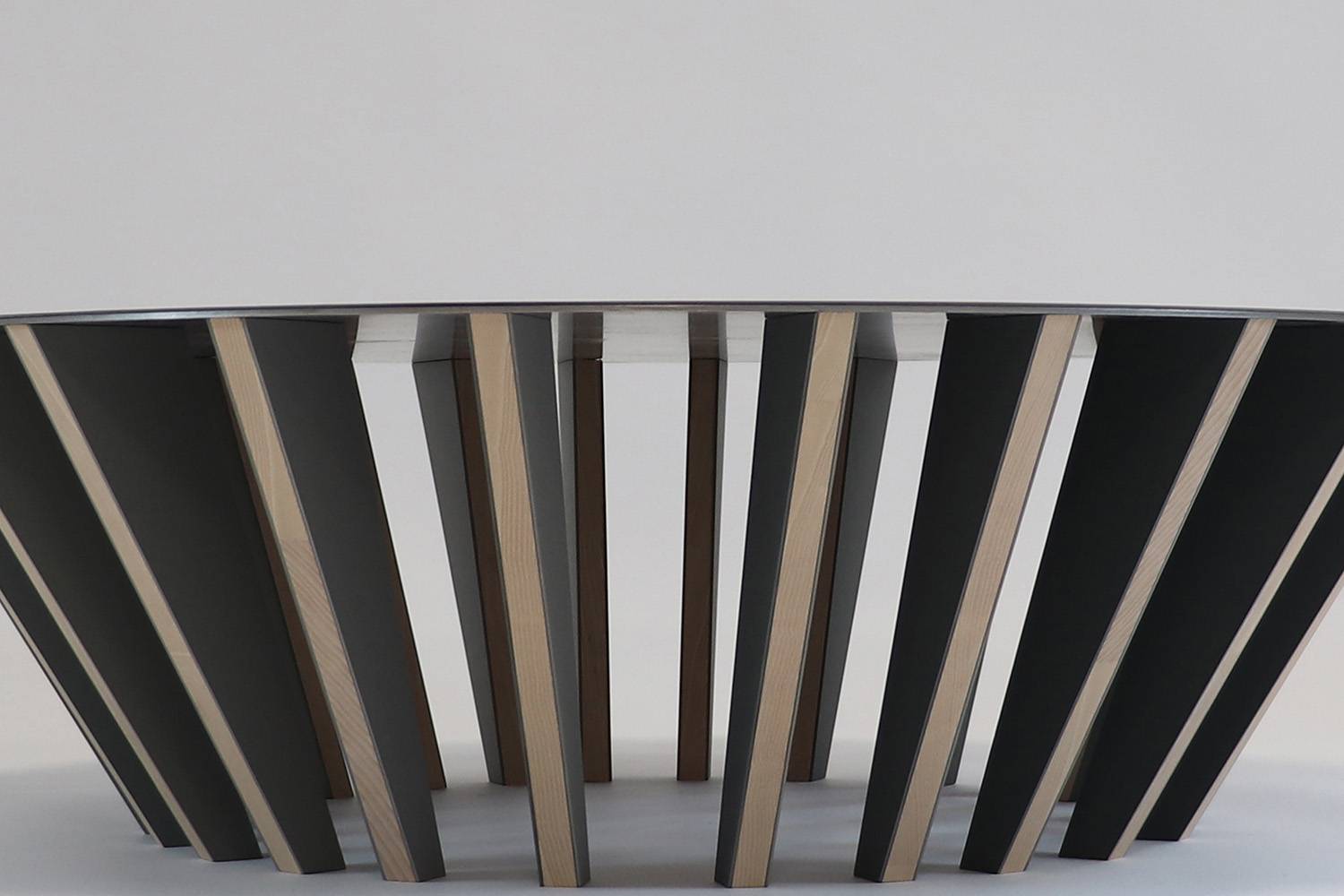 our favorite in the series. tabletop, table legs, carcass? all unnecessary. instead, this table is made of 40 vertical plates, each connected by a hinge. each plate can be rotated independently of the others. a thousand shapes are possible: from square to curved, even a circle. the highlight: elements can be added in any number. how long do you think the longest spine will be?