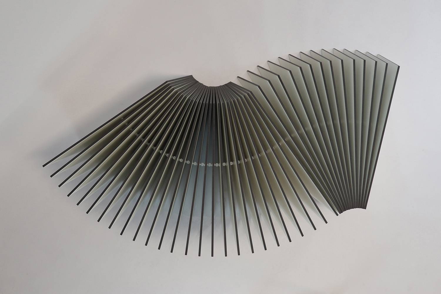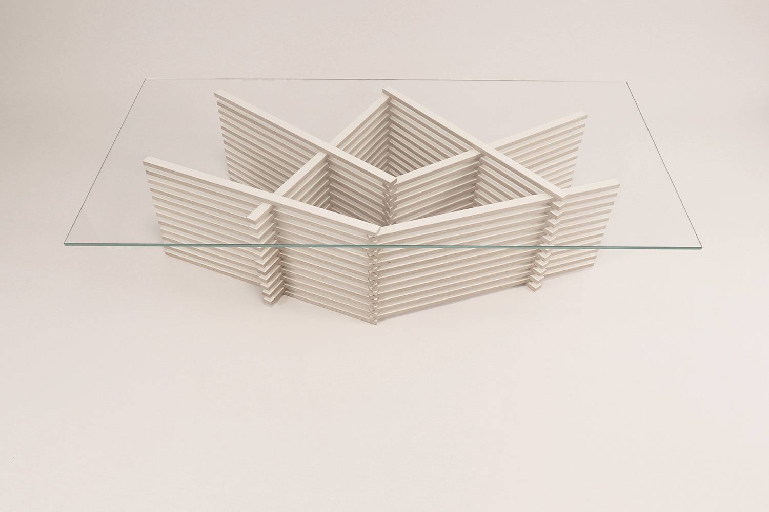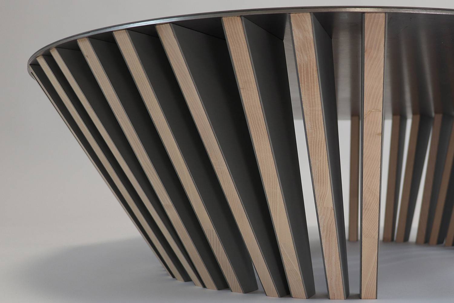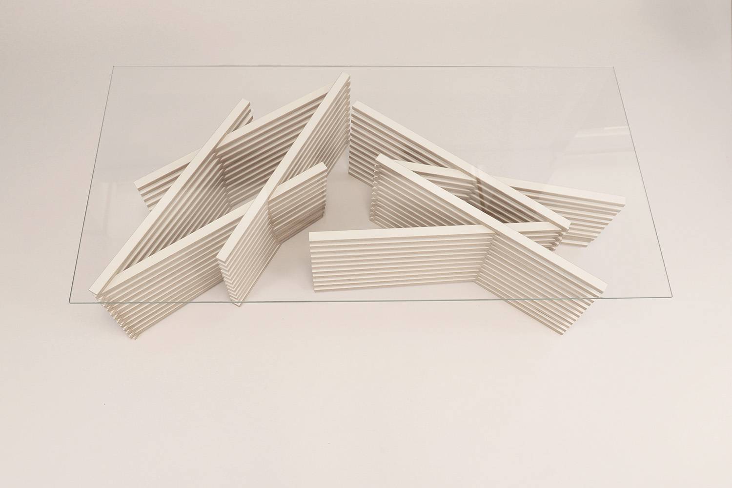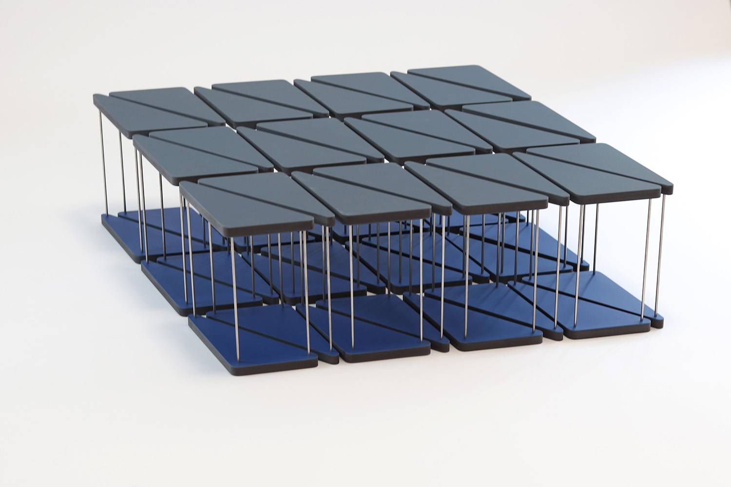 our favorite in the series. tabletop, table legs, carcass? all unnecessary. instead, this table is made of 40 vertical plates, each connected by a hinge. each plate can be rotated independently of the others. a thousand shapes are possible: from square to curved, even a circle. the highlight: elements can be added in any number. how long do you think the longest spine will be?