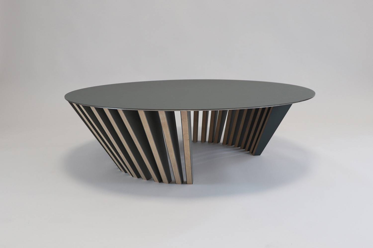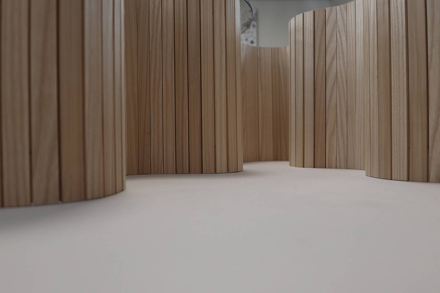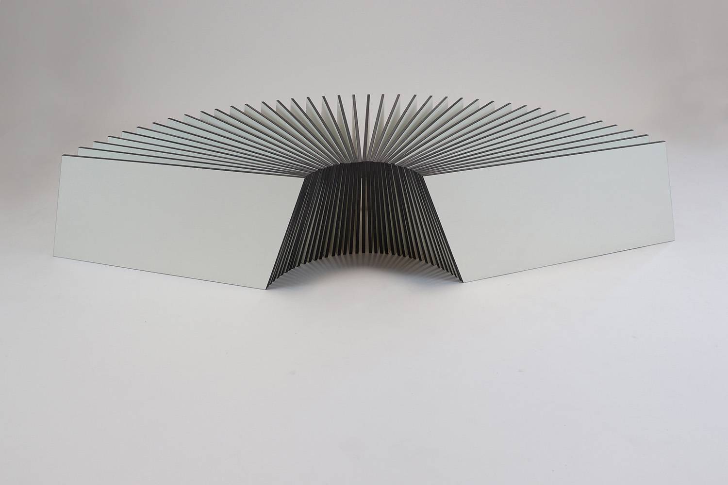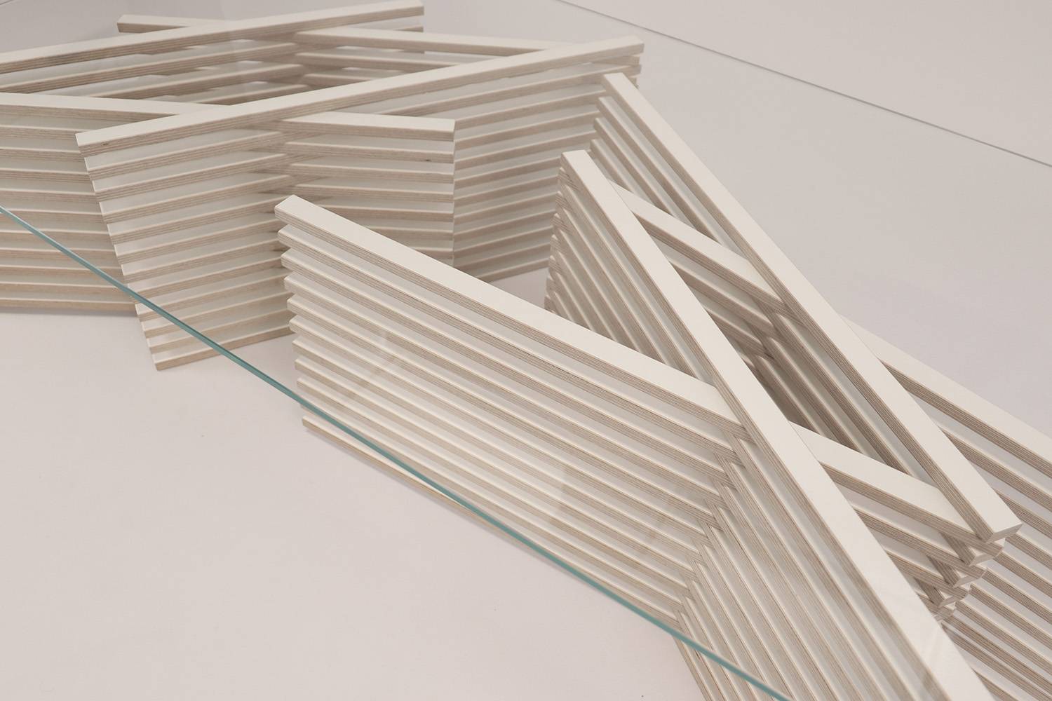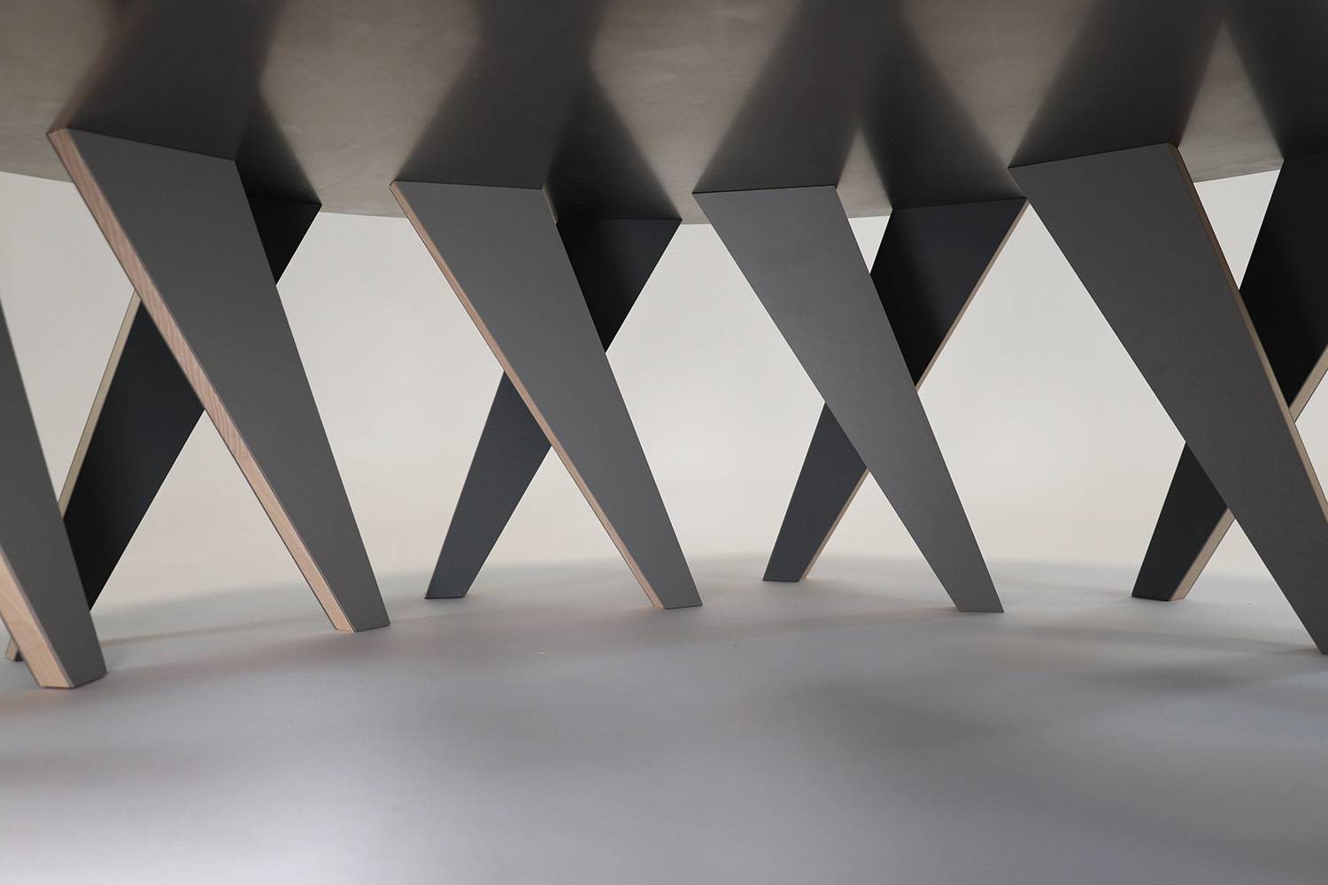 our favorite in the series. tabletop, table legs, carcass? all unnecessary. instead, this table is made of 40 vertical plates, each connected by a hinge. each plate can be rotated independently of the others. a thousand shapes are possible: from square to curved, even a circle. the highlight: elements can be added in any number. how long do you think the longest spine will be?