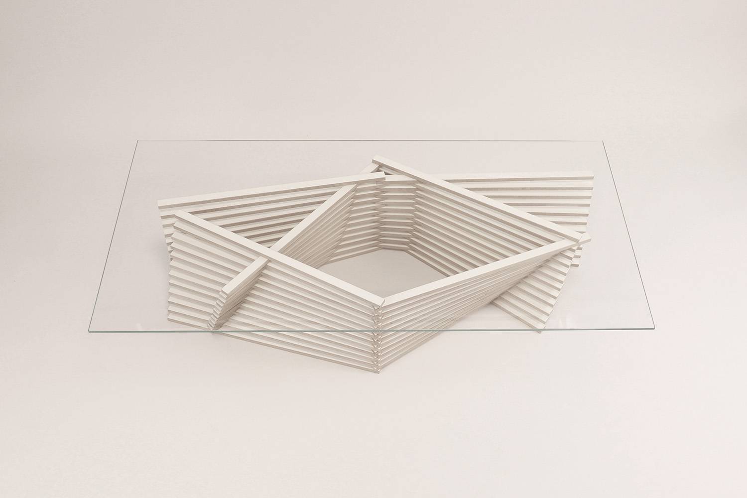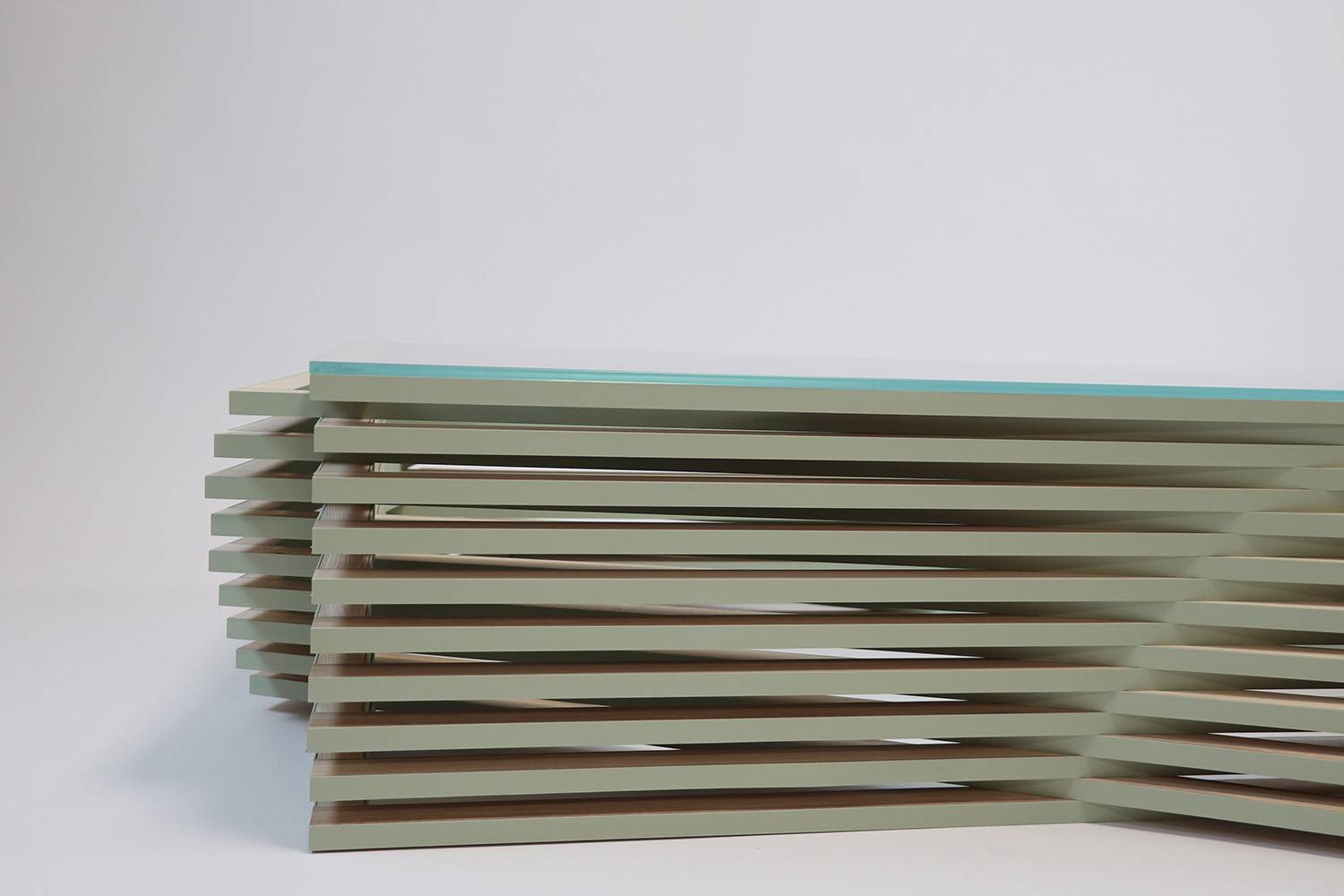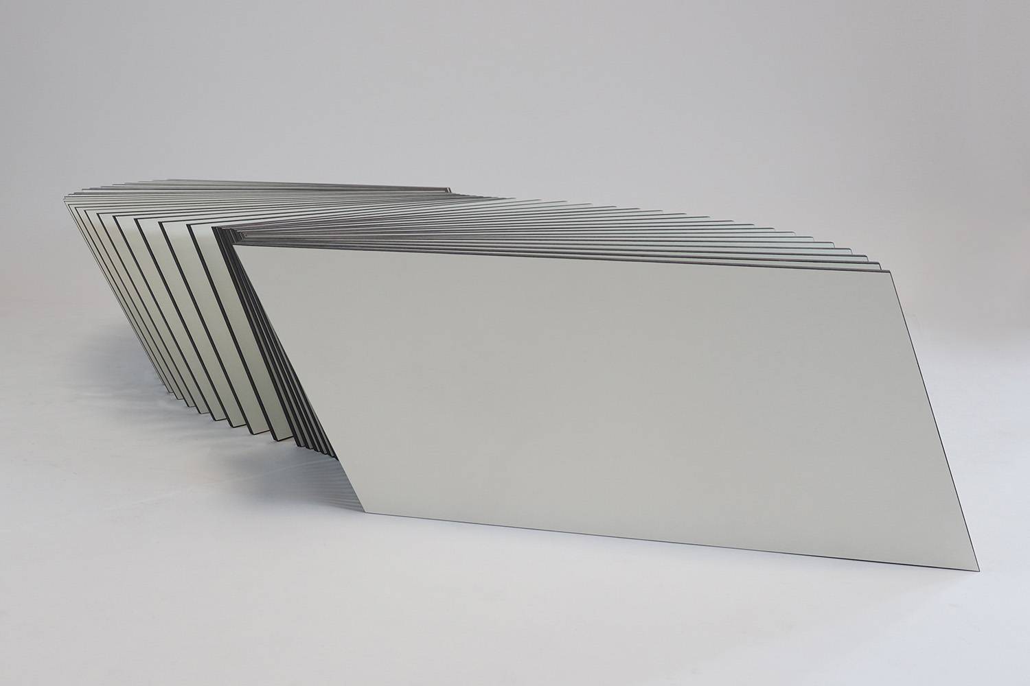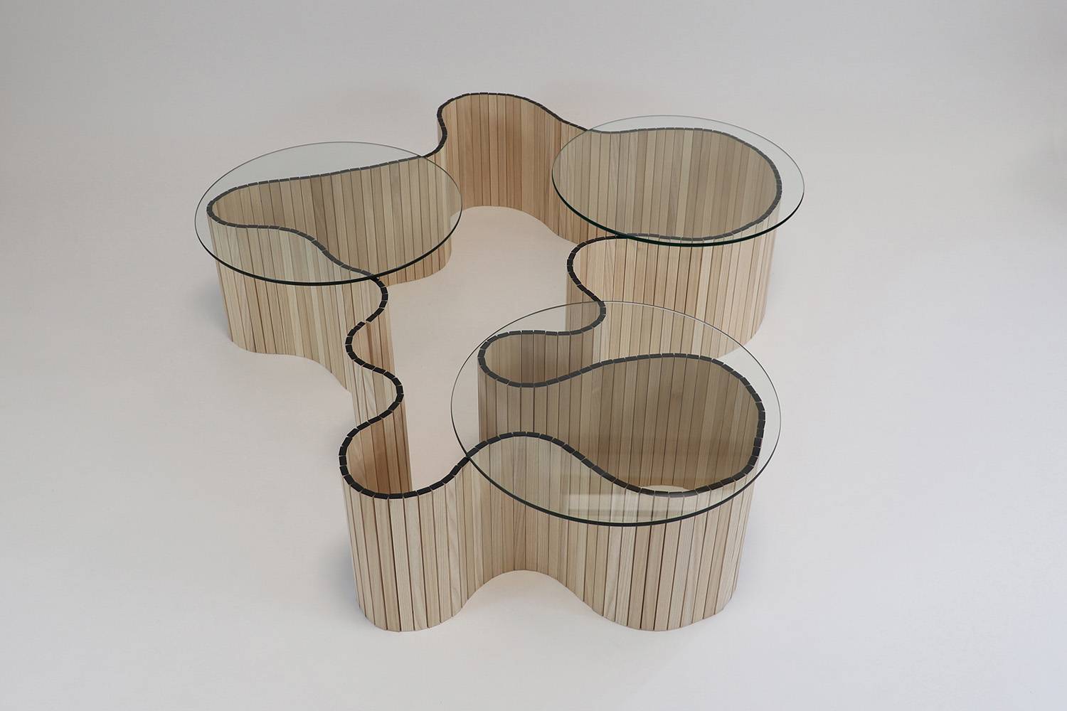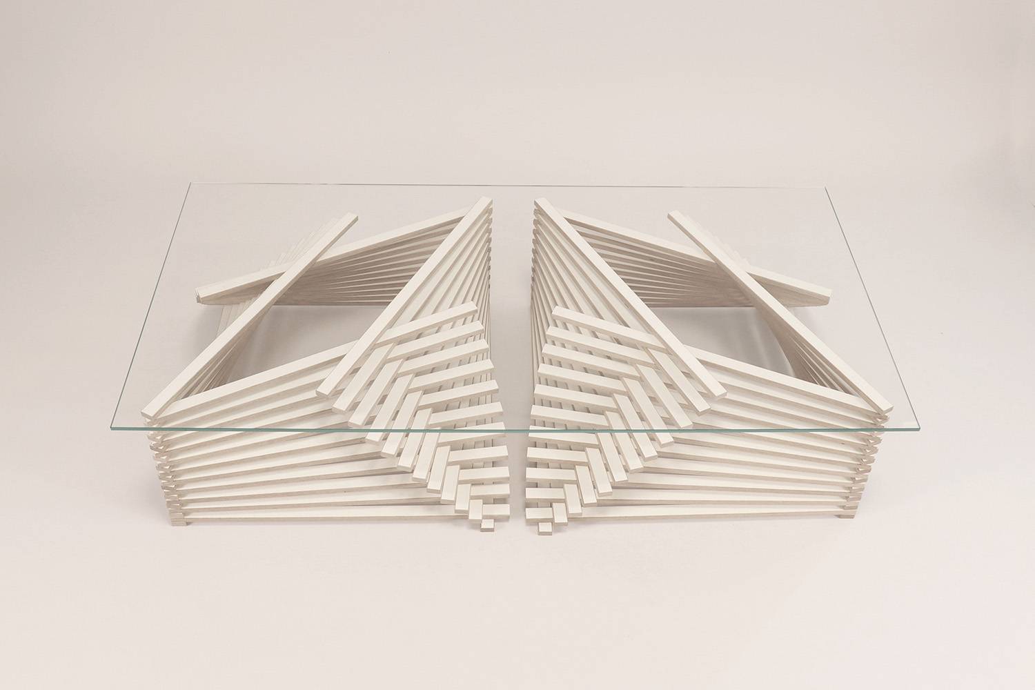 our favorite in the series. tabletop, table legs, carcass? all unnecessary. instead, this table is made of 40 vertical plates, each connected by a hinge. each plate can be rotated independently of the others. a thousand shapes are possible: from square to curved, even a circle. the highlight: elements can be added in any number. how long do you think the longest spine will be?