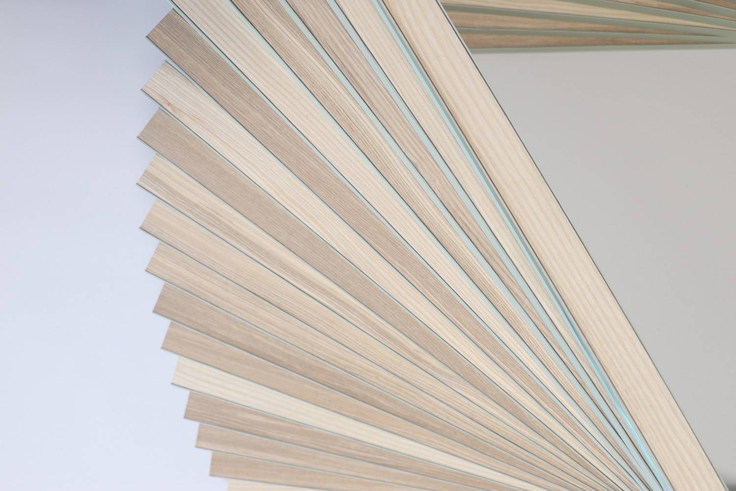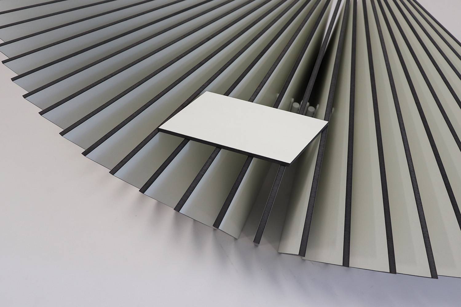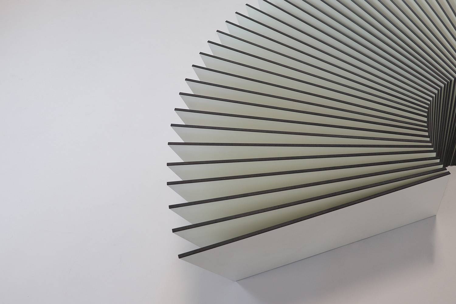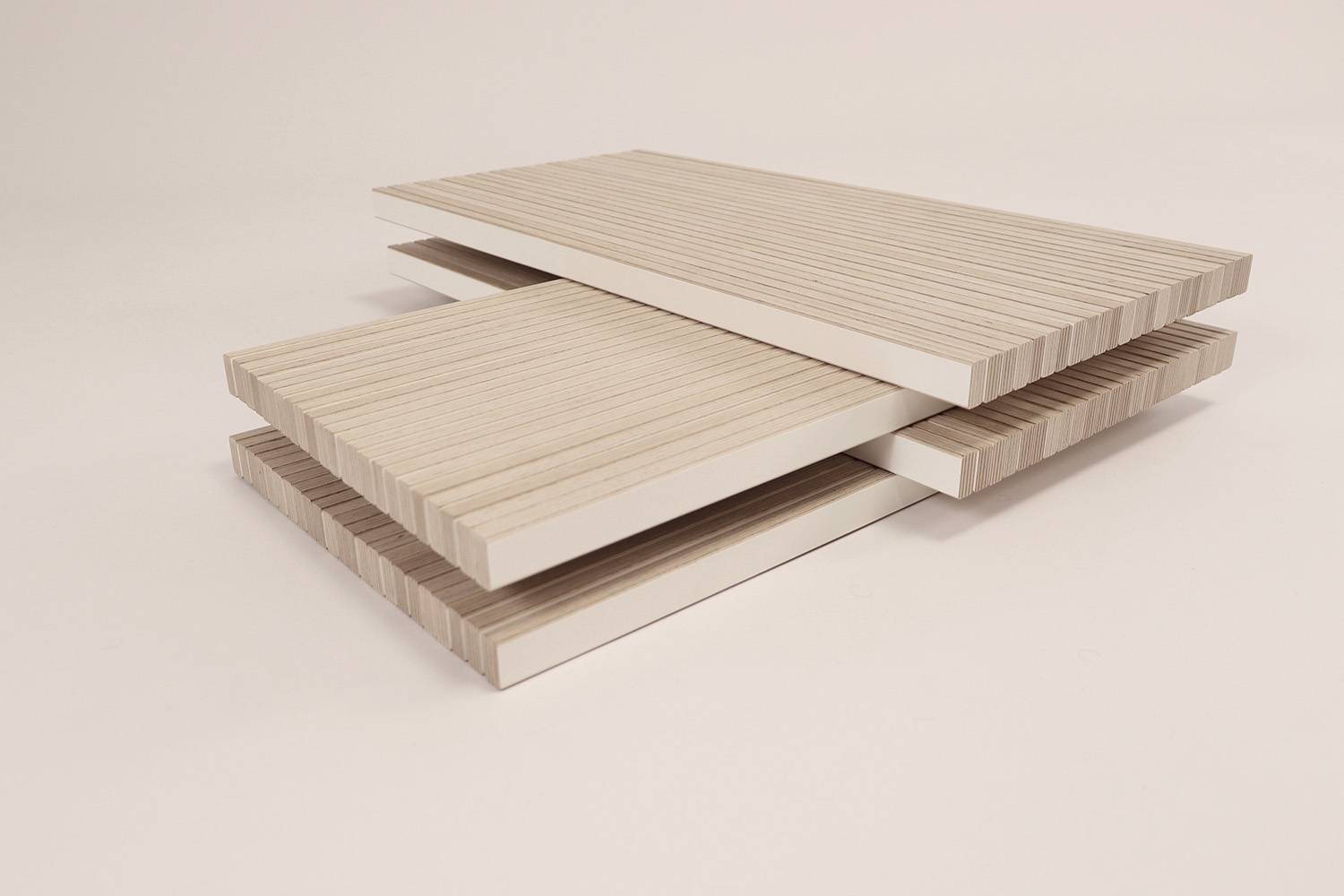 the 92 slats are made of high-quality birch plywood, coated on both sides with resistant white melanin. each module is held together on the inside by a steel rod. the 8mm thick panel is made of extra transparent safety glass.
