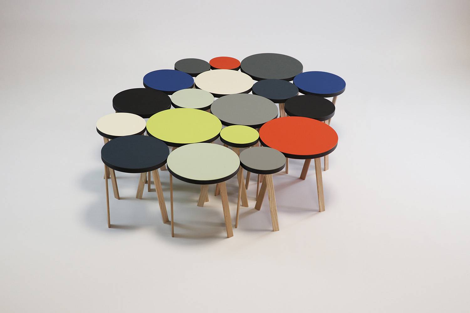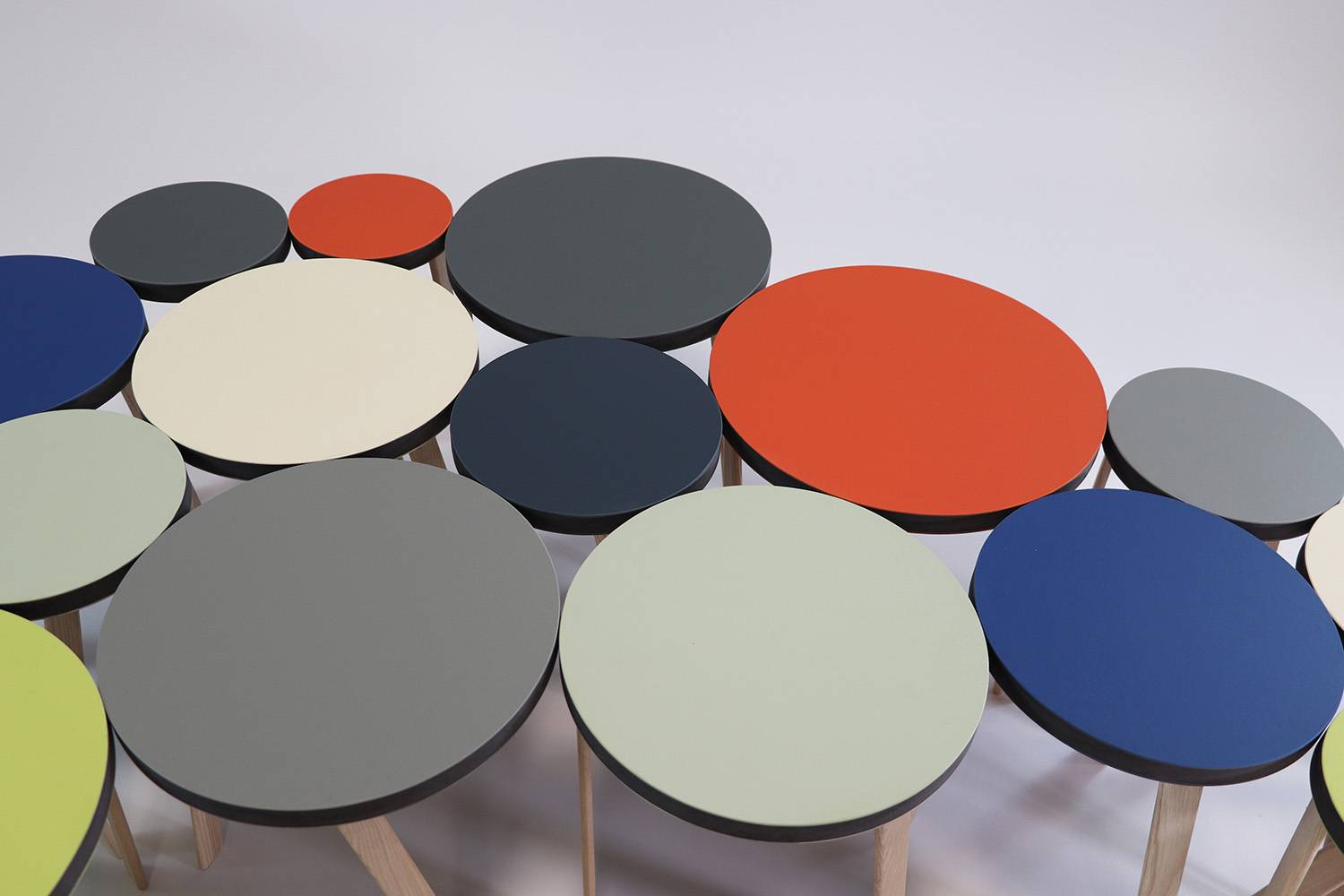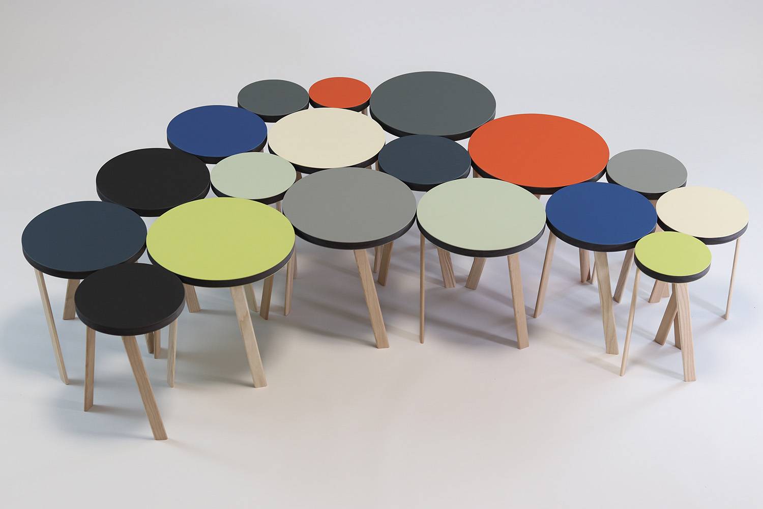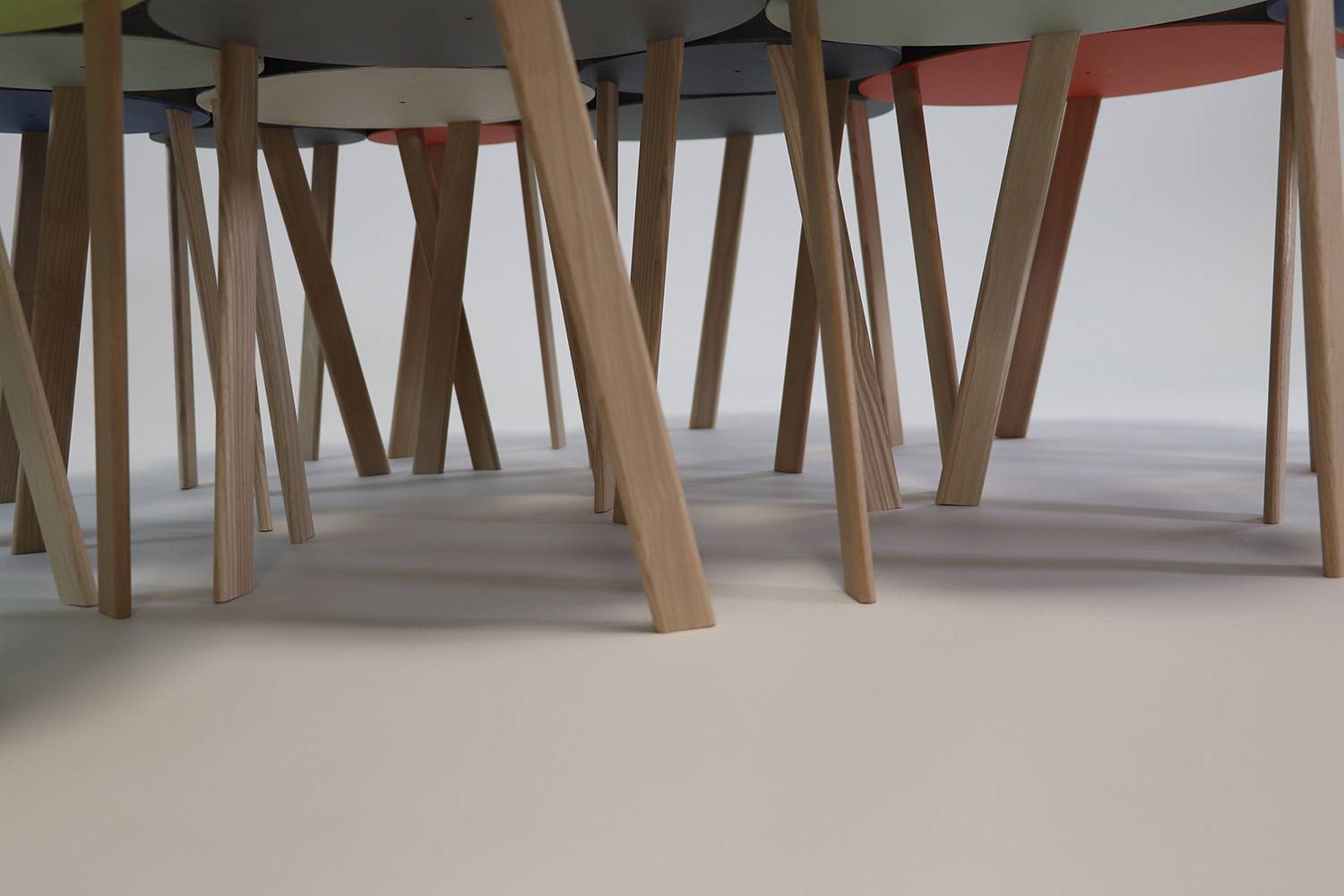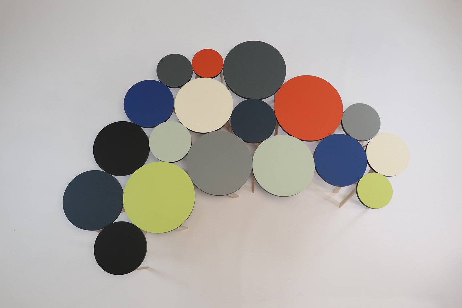 the 18 single elements are made of black mdf softwood and covered on both sides with furniture linoleum, a natural high-quality material with a long history, available in a total of 9 colors. the smallest element is 15cm in diameter, with the others widening gradually by one centimeter. the legs are made of european ash and left natural.