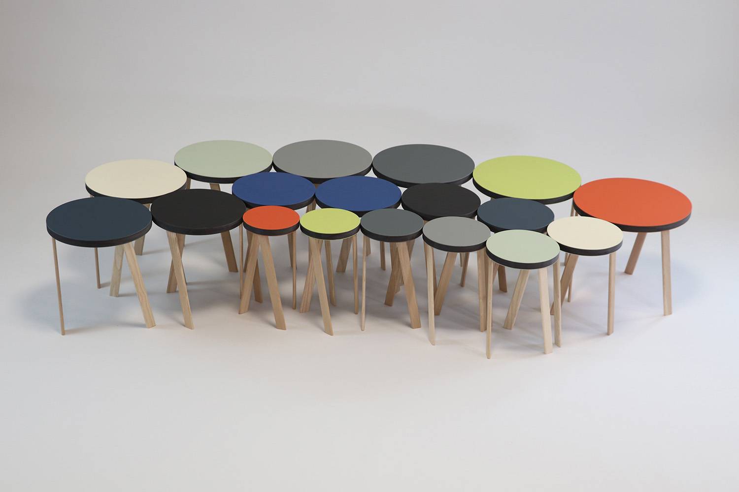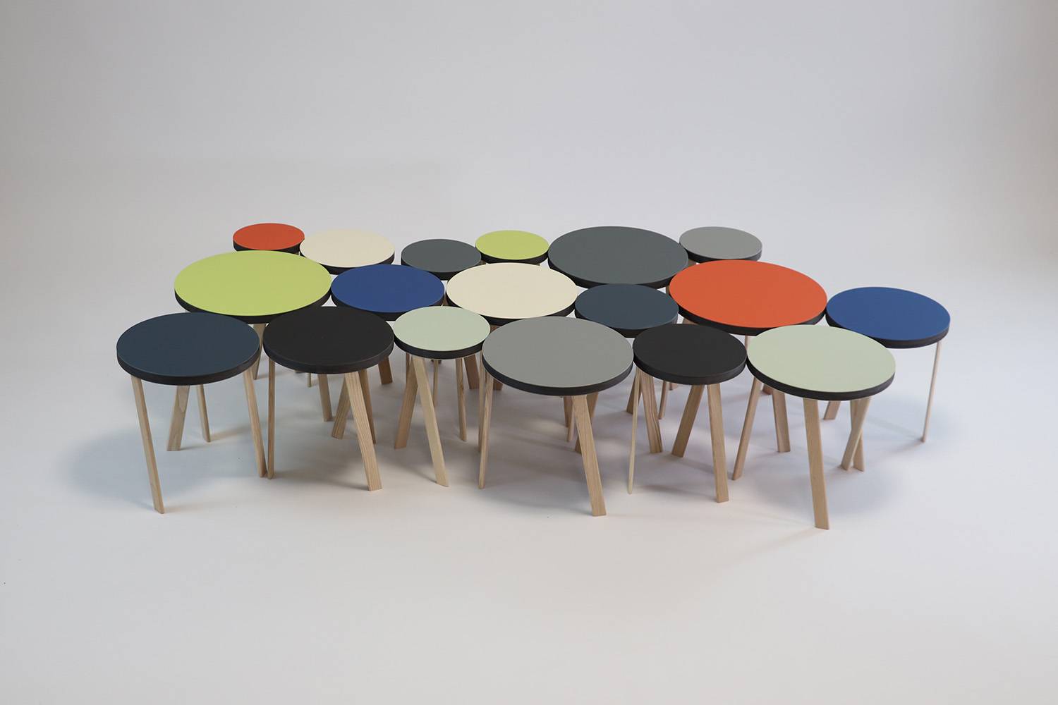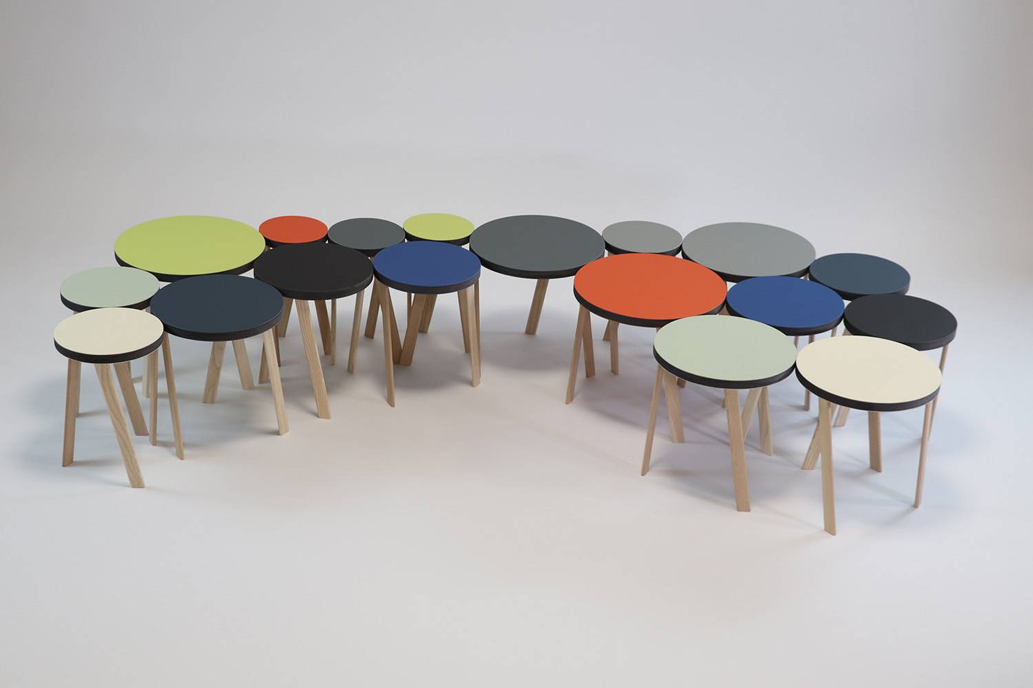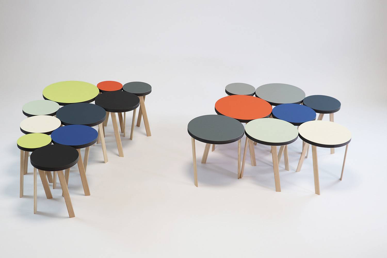 the 18 single elements are made of black mdf softwood and covered on both sides with furniture linoleum, a natural high-quality material with a long history, available in a total of 9 colors. the smallest element is 15cm in diameter, with the others widening gradually by one centimeter. the legs are made of european ash and left natural.