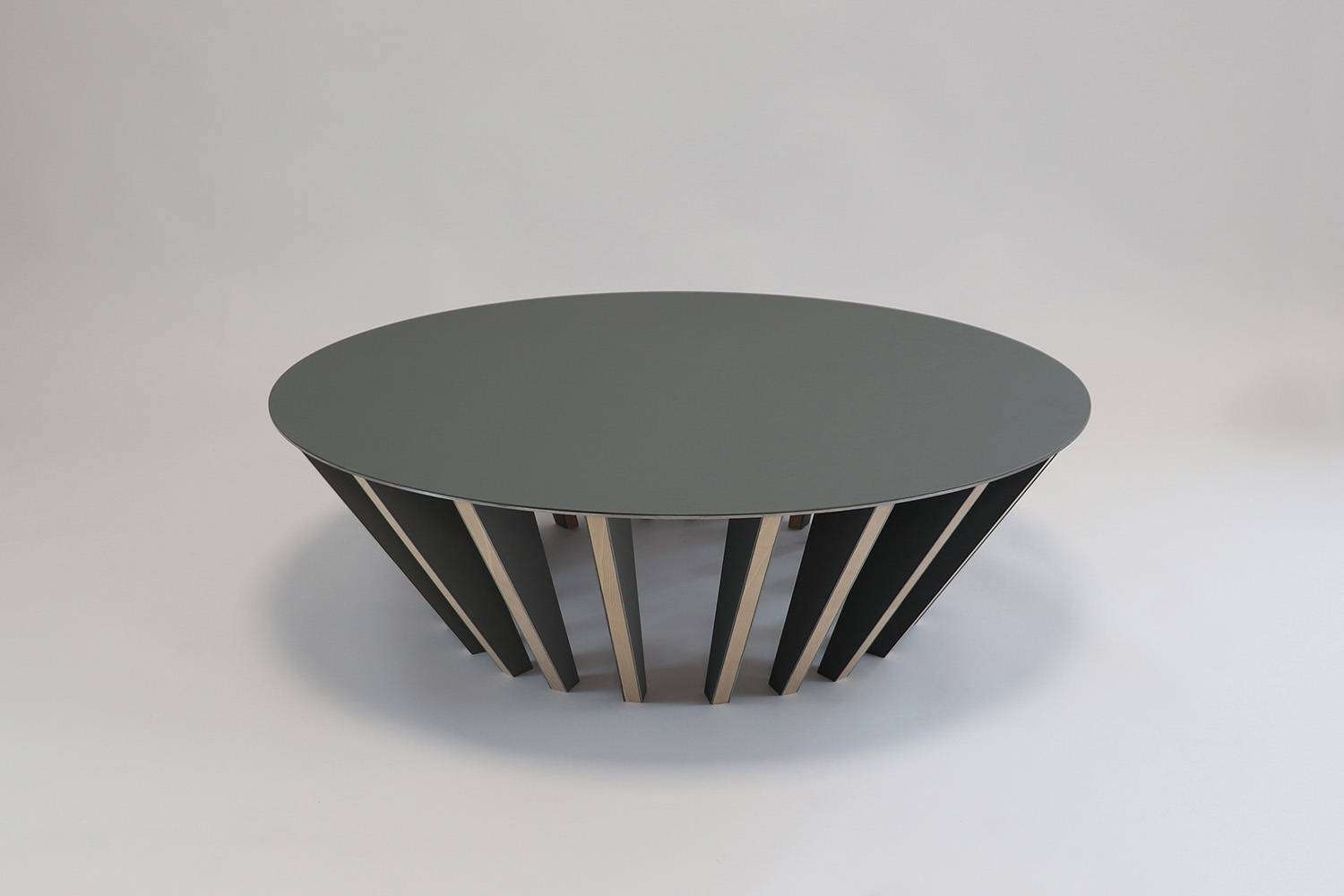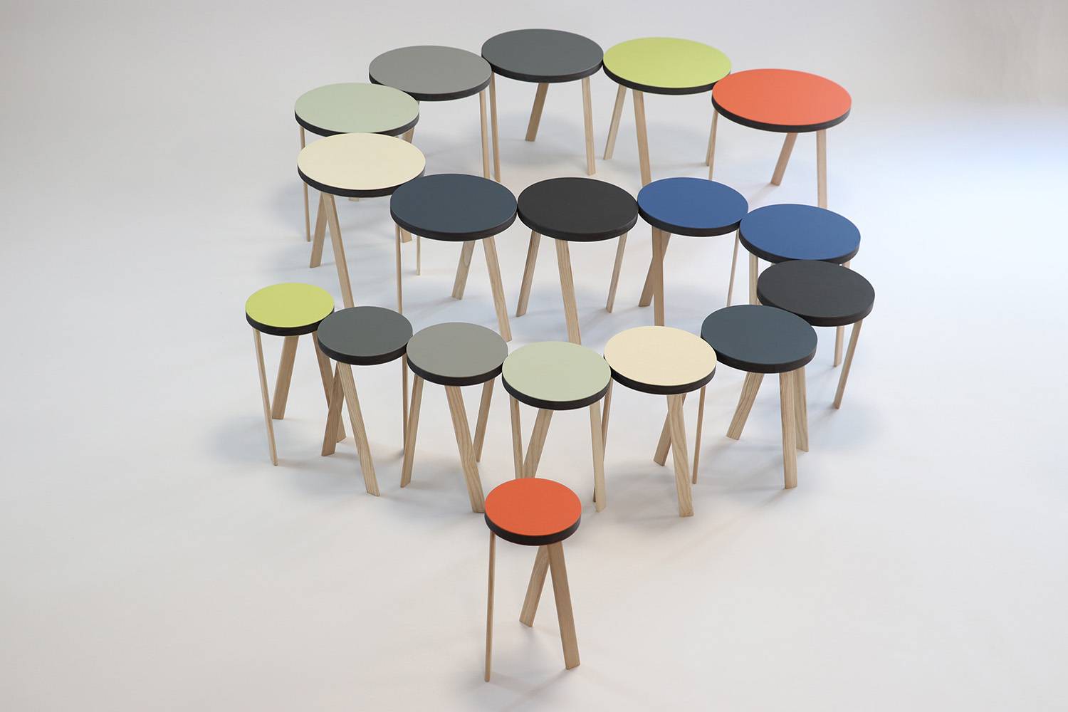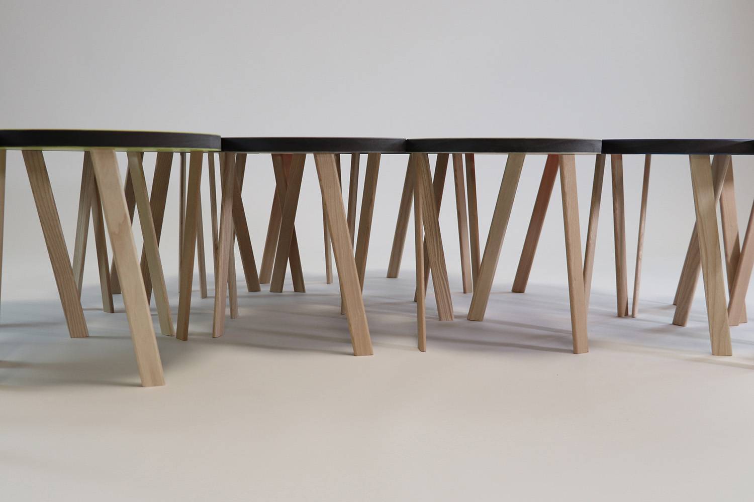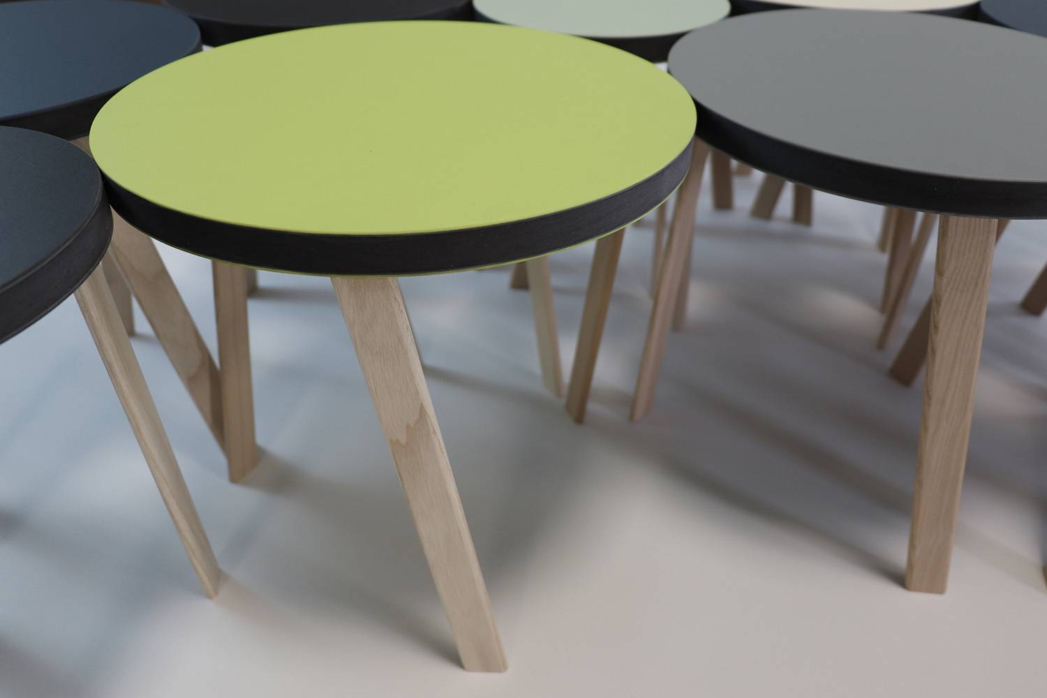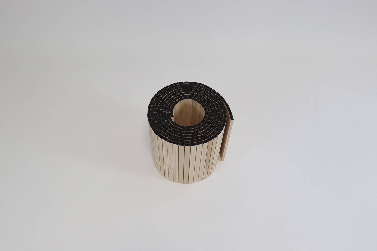 the 18 single elements are made of black mdf softwood and covered on both sides with furniture linoleum, a natural high-quality material with a long history, available in a total of 9 colors. the smallest element is 15cm in diameter, with the others widening gradually by one centimeter. the legs are made of european ash and left natural.
