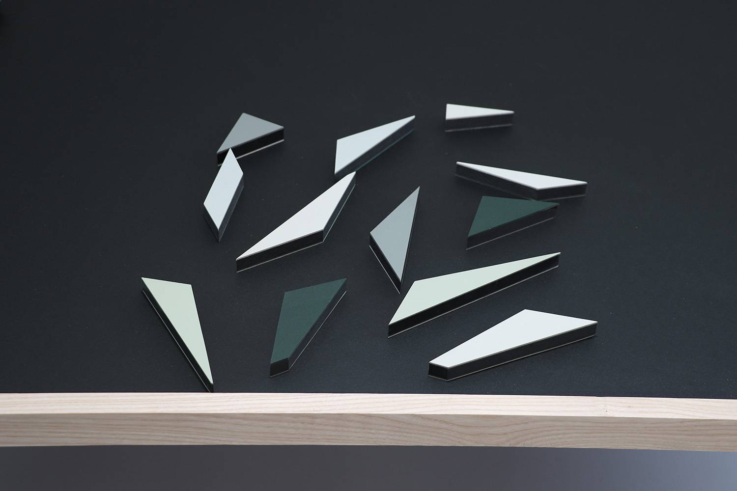 the legs and frames are made of natural european ash wood. the top is covered on both sides with black linoleum, a high-quality natural material with a long history. the triangles and squares are made of black mdf softwood and are covered on both sides with colored linoleum. each variant includes six colors, with two colors always forming a pair.