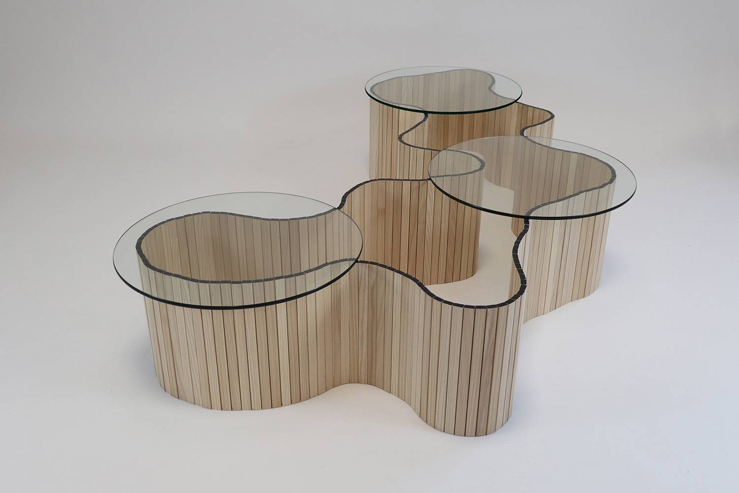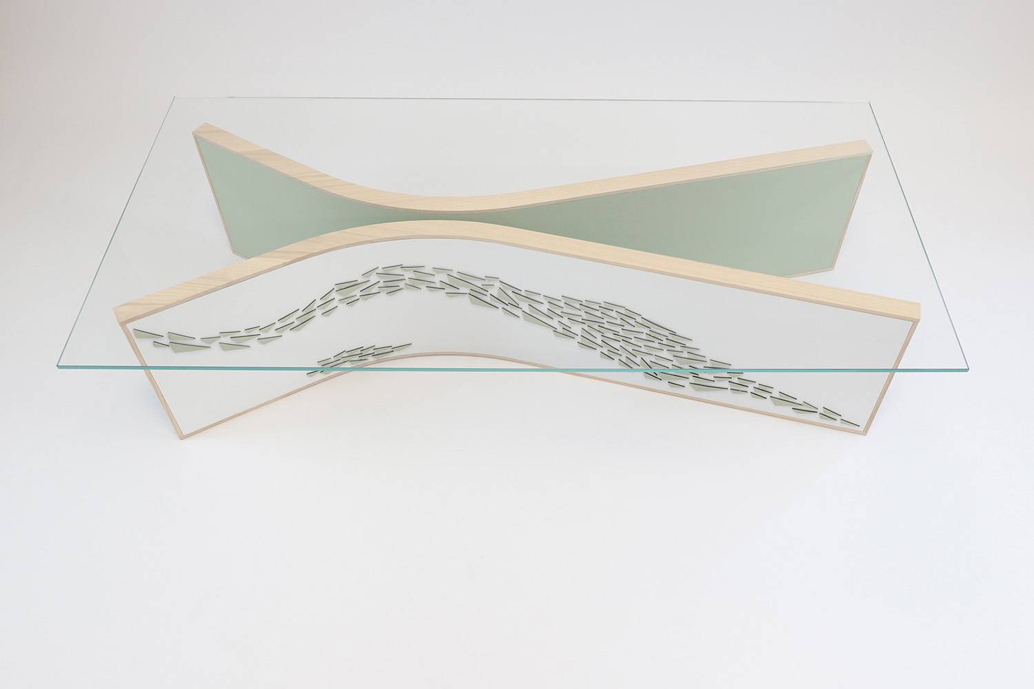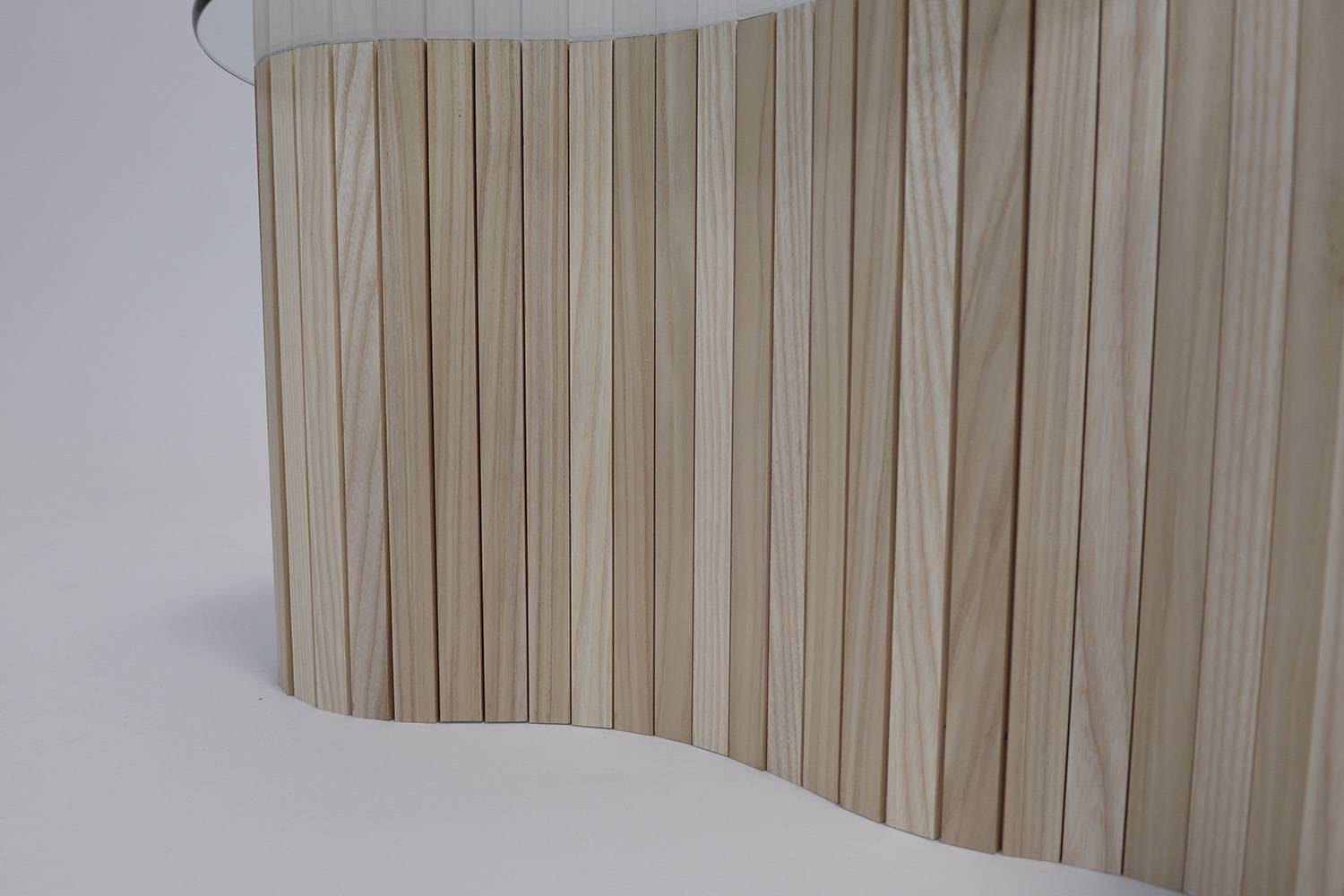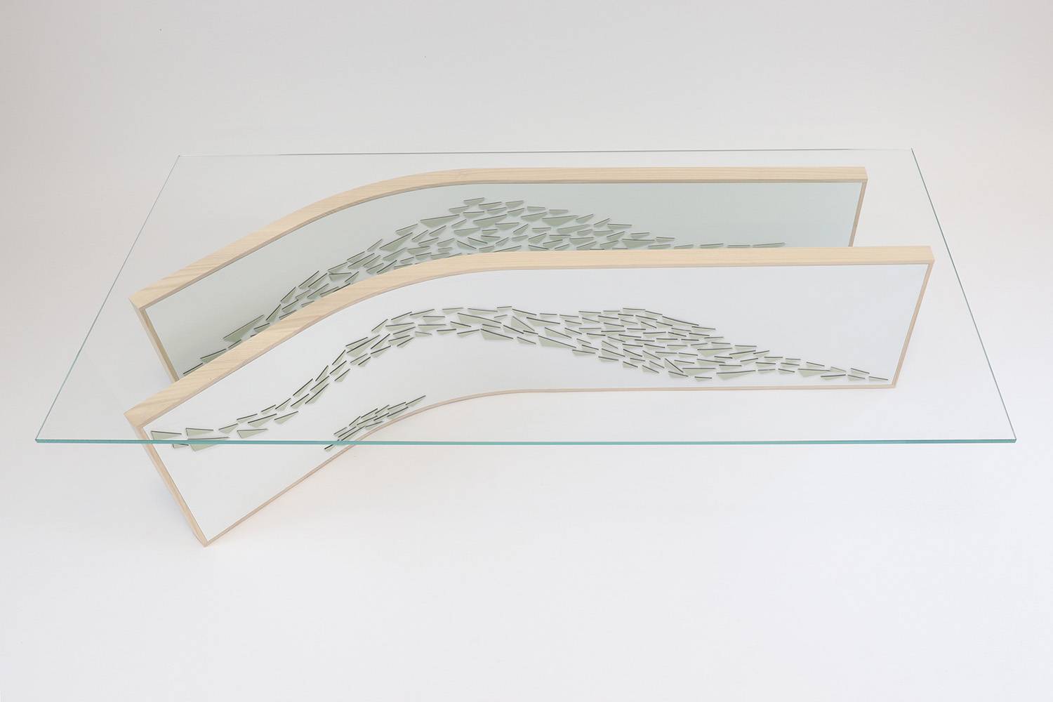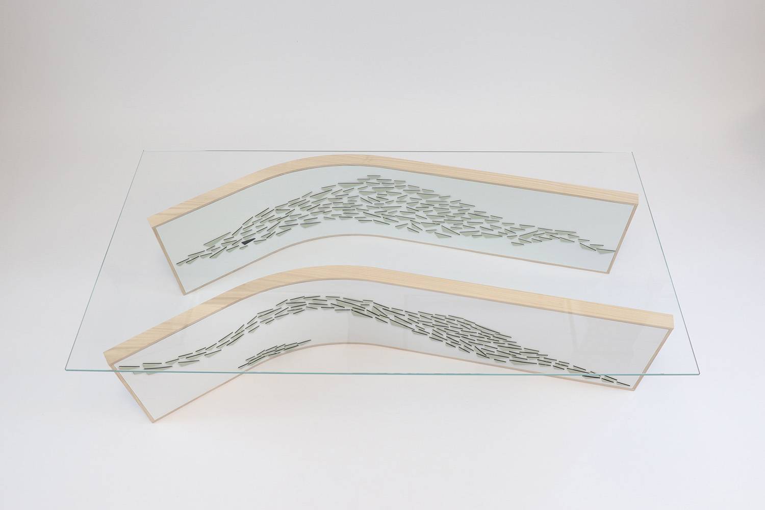 table or sculpture? since the three freely arrangeable glass plates allow you to put something on top of it, technically speaking, this is a table. an incomparably beautiful table. 250 narrow slats form a 5 meter long and 30cm high worm. inside of the table run two copper wires, which keep it in shape. initially, however, you may meander it through the room. you don’t want to stop looking at it. just feeling the wood is even better. but here the possibilities of the internet end. your only option left is to buy.