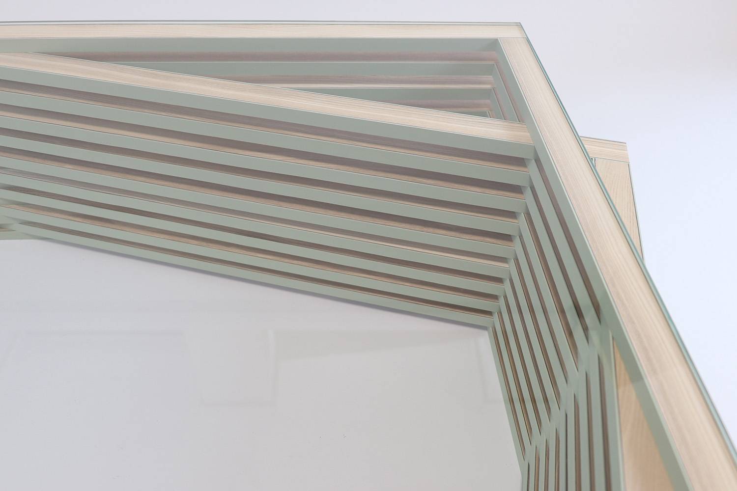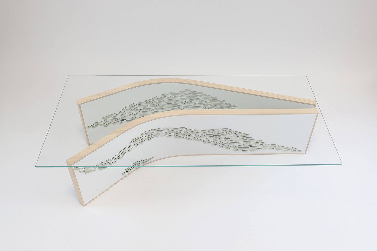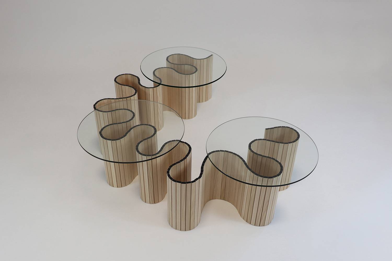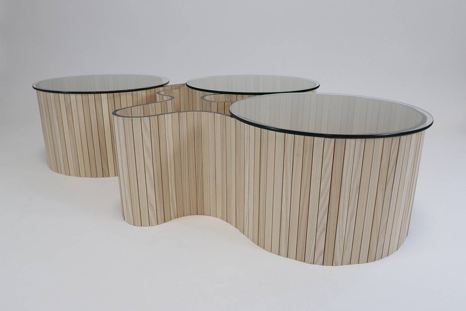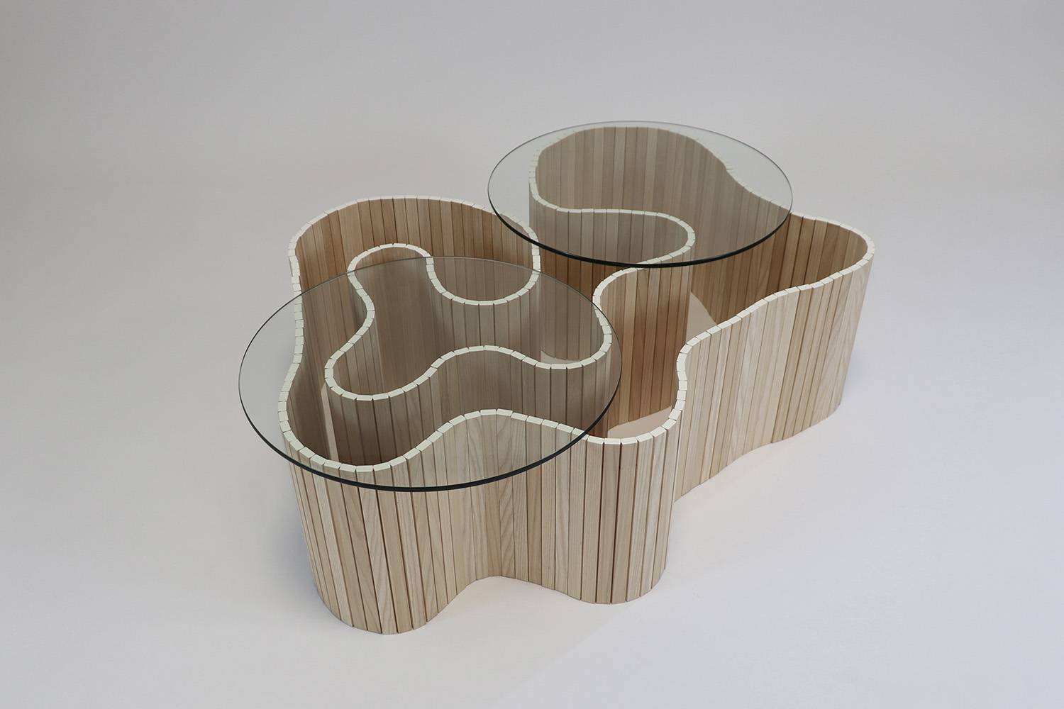 table or sculpture? since the three freely arrangeable glass plates allow you to put something on top of it, technically speaking, this is a table. an incomparably beautiful table. 250 narrow slats form a 5 meter long and 30cm high worm. inside of the table run two copper wires, which keep it in shape. initially, however, you may meander it through the room. you don’t want to stop looking at it. just feeling the wood is even better. but here the possibilities of the internet end. your only option left is to buy.