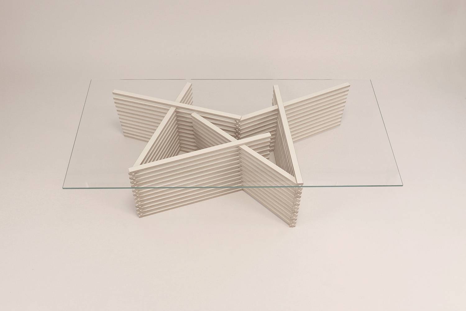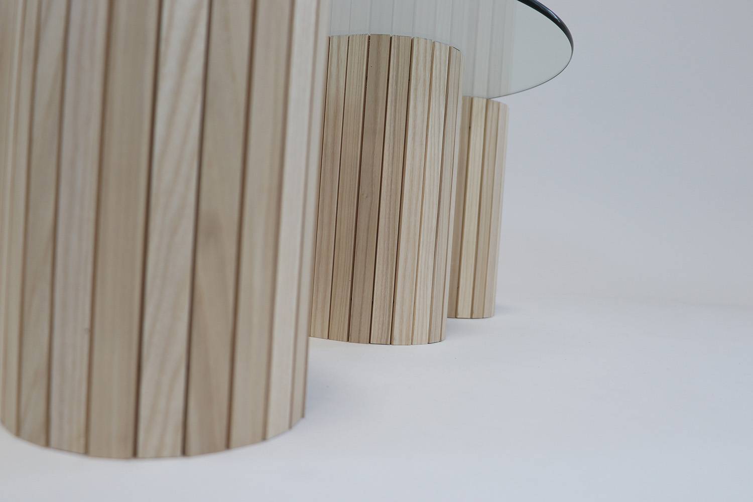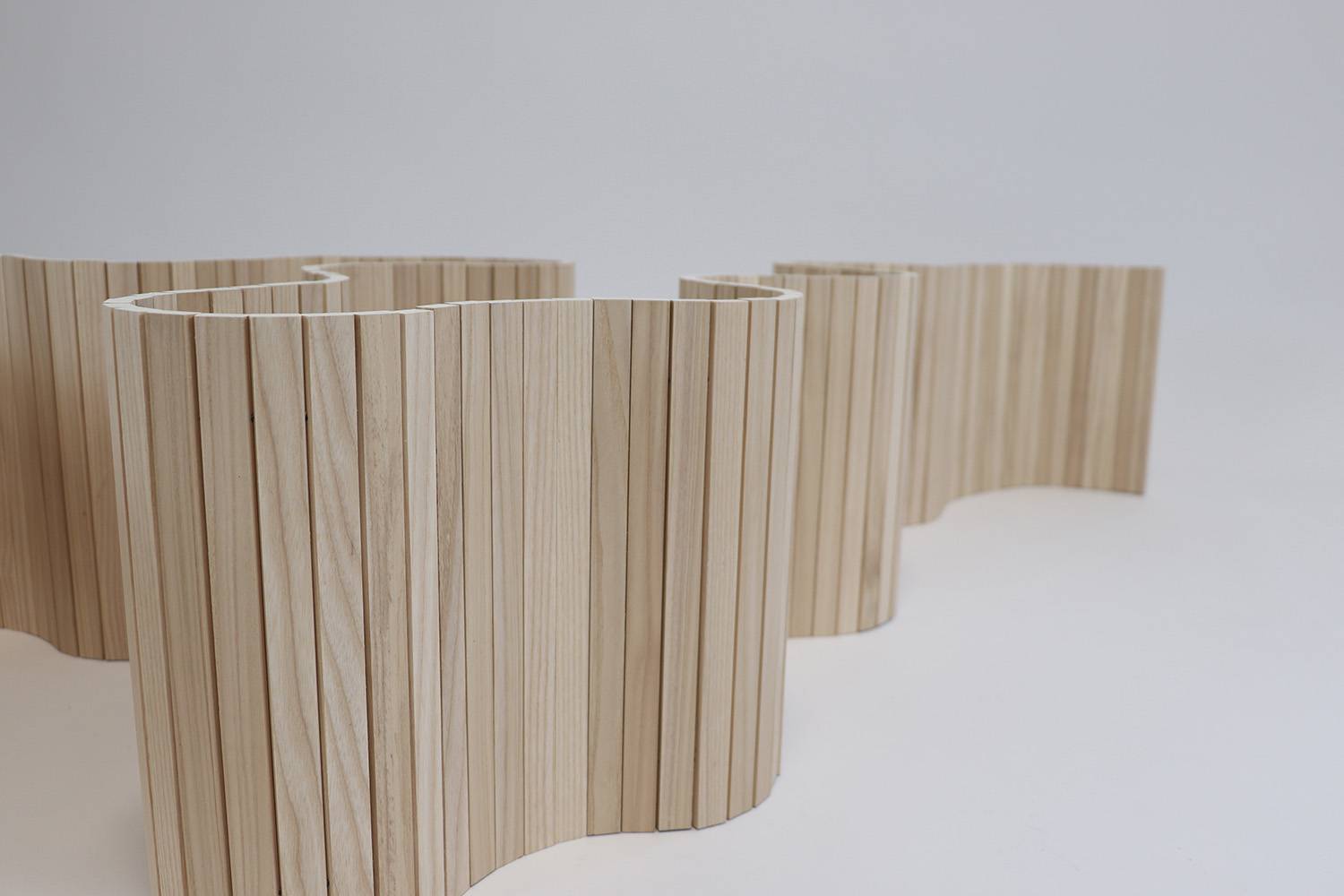 a table as beautiful as only architecture can be: simple and extravagant. straight and curved. four modules, each with 23 rotatable fine slats, form the corpus. they want to be freely combined with each other in a thousand forms. one slat fits into the other with ease. in the end, it even becomes stable. what luck.