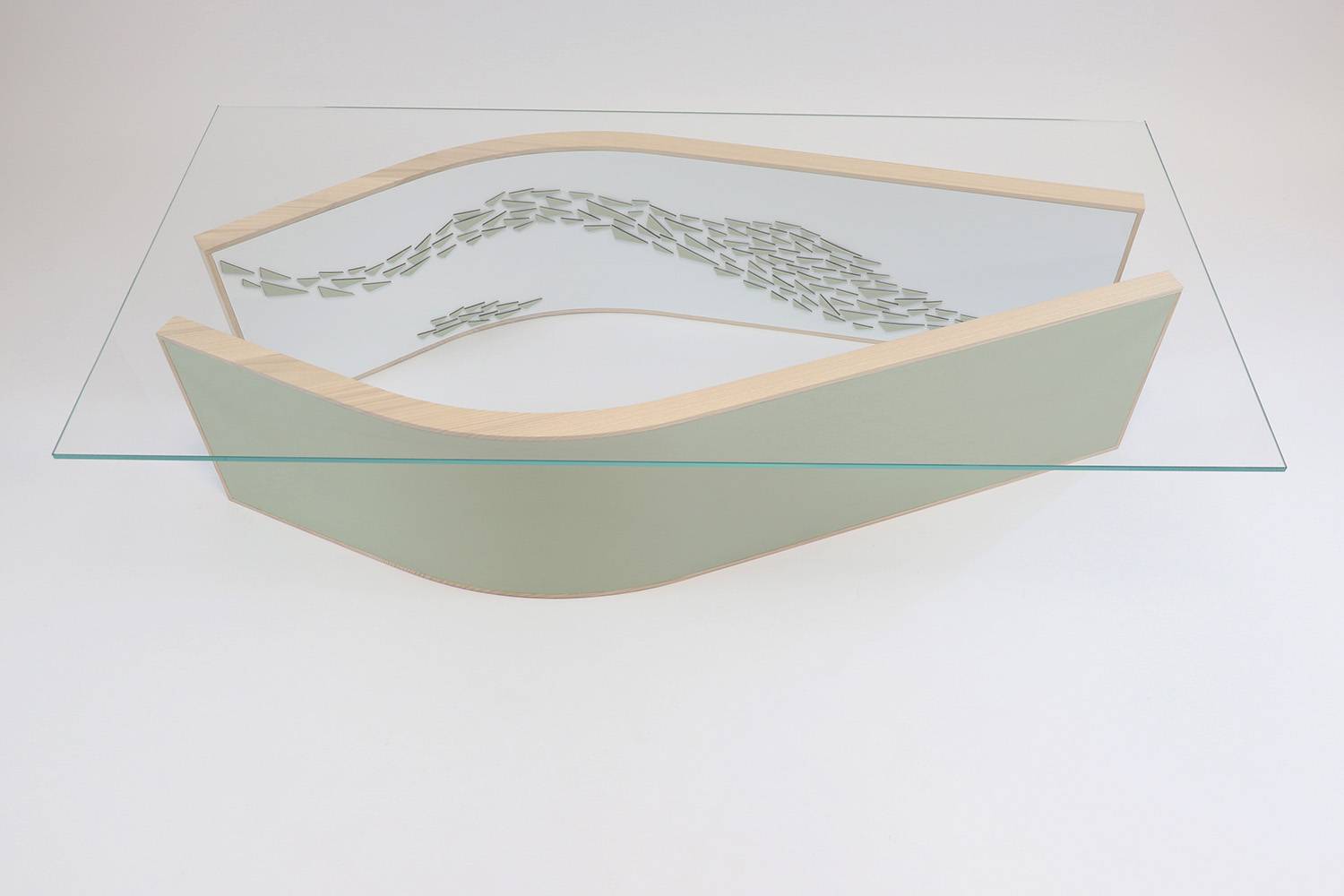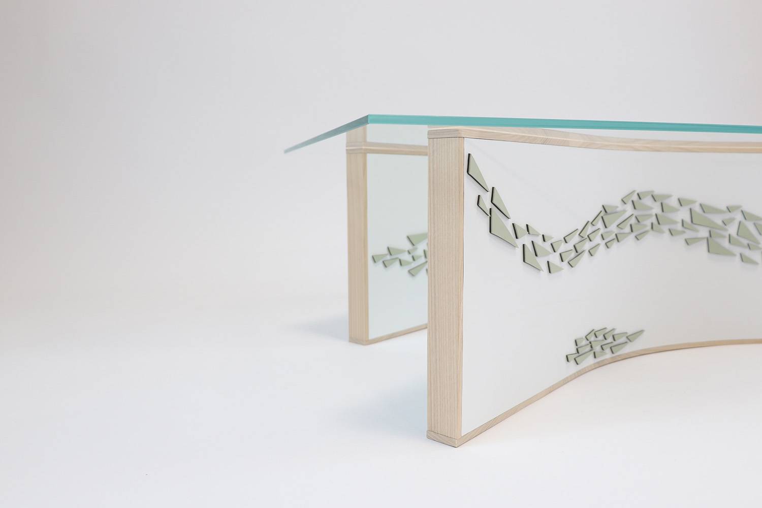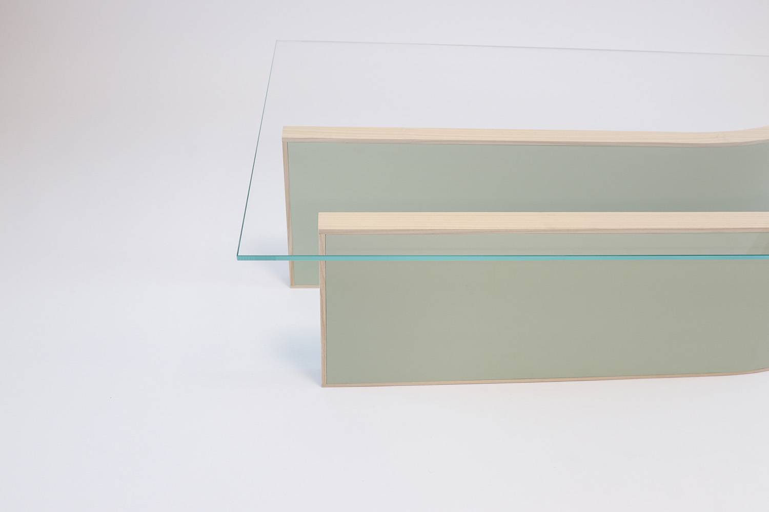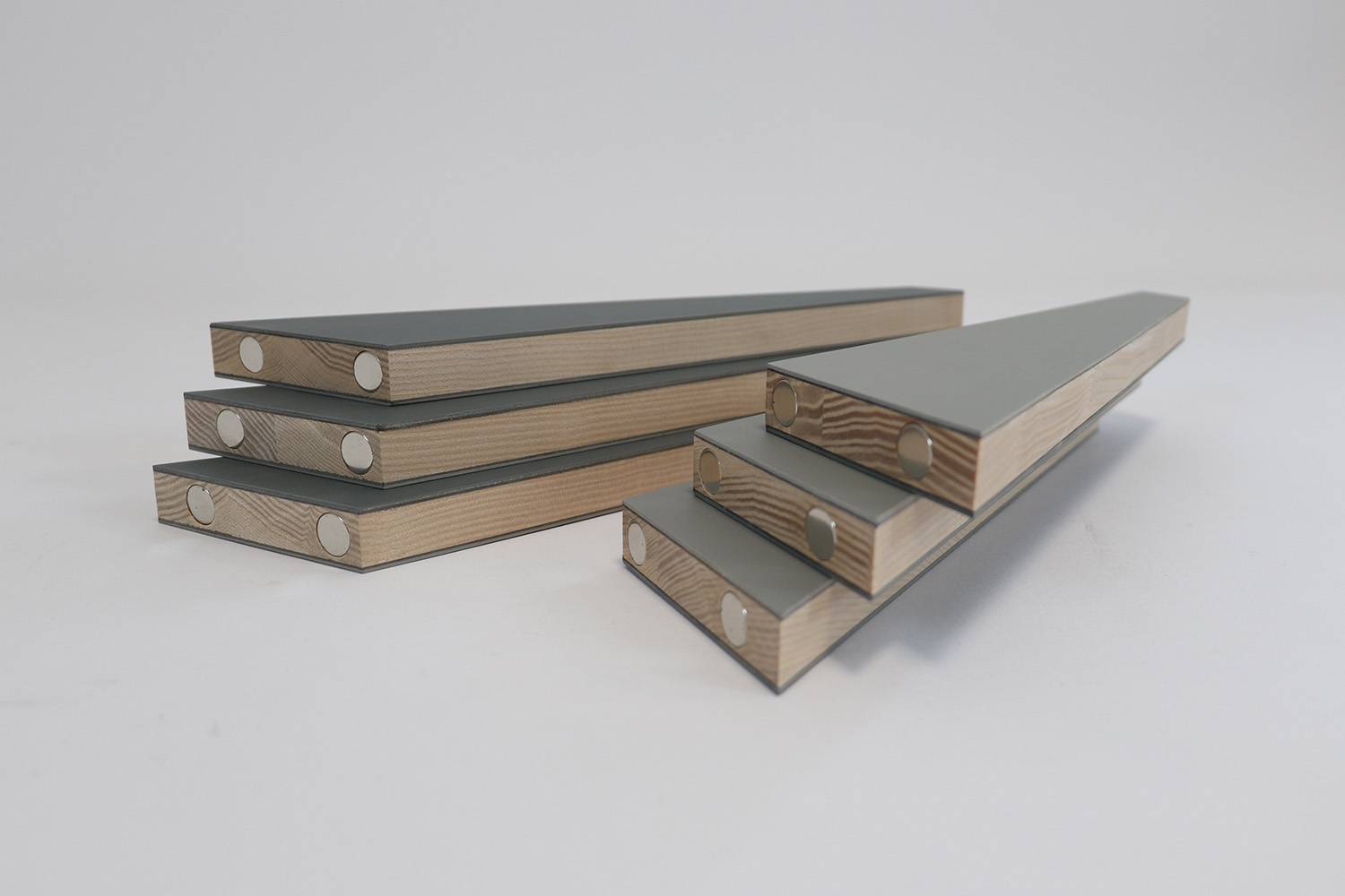 the two elements are made of bent mdf softwood. one side is covered with furniture linoleum, a high-quality and eco-friendly material. there are four colors to choose from. the opposite side is covered with a white iron foil, on which the magnetic pieces of furniture linoleum stick. the edges are made of european ash wood and the tabletop is made of extra transparent 8mm safety glass.
