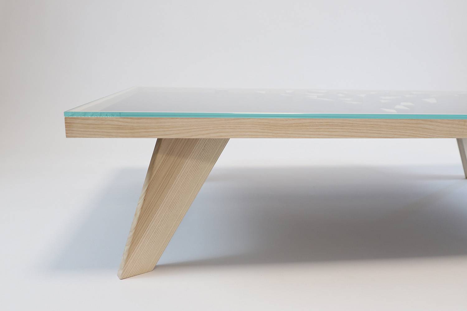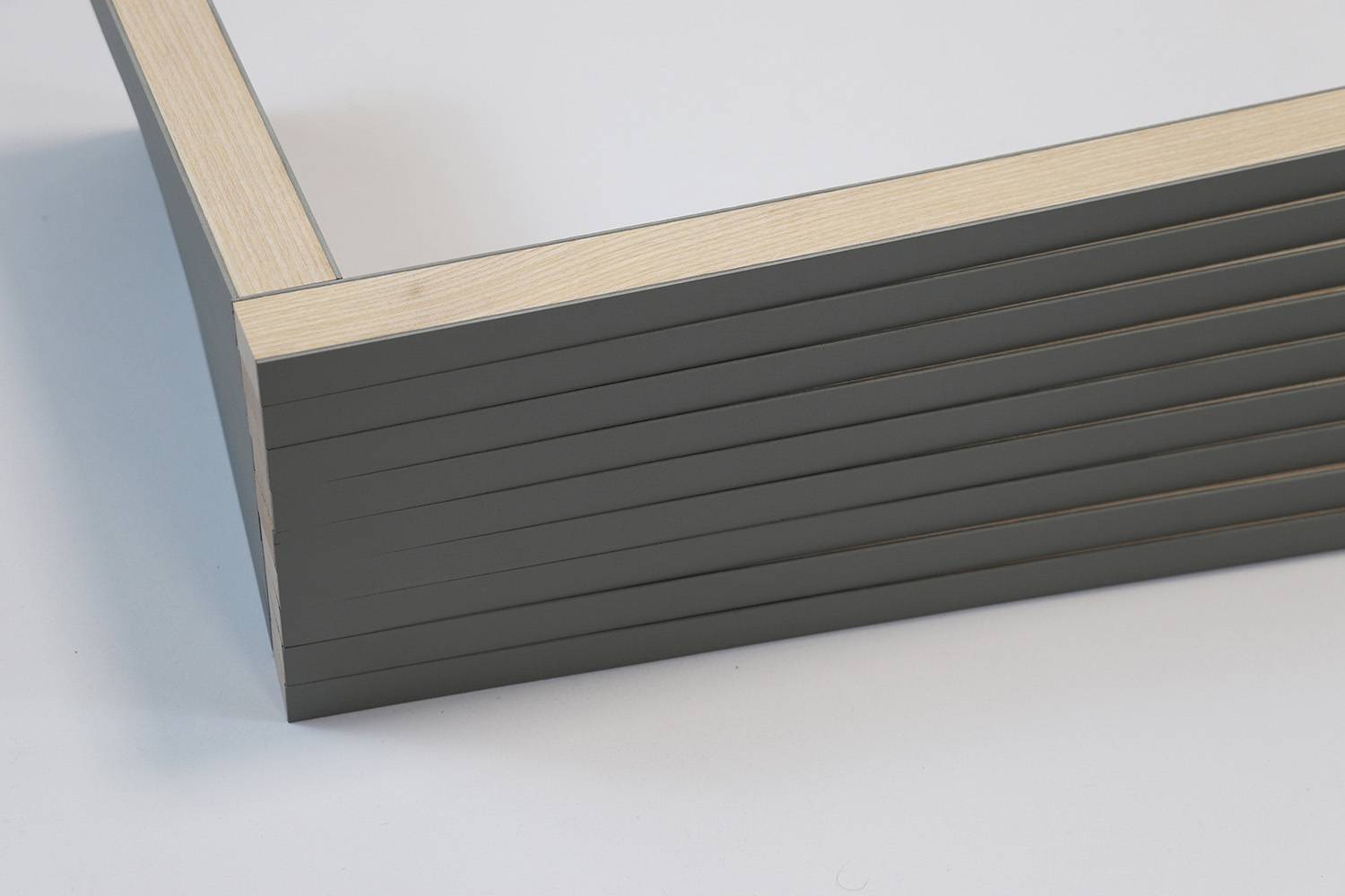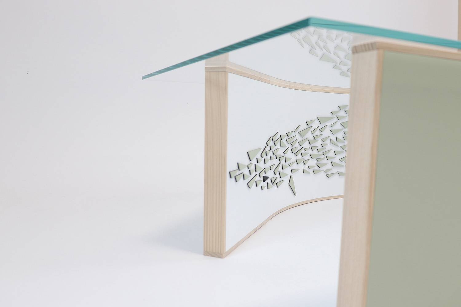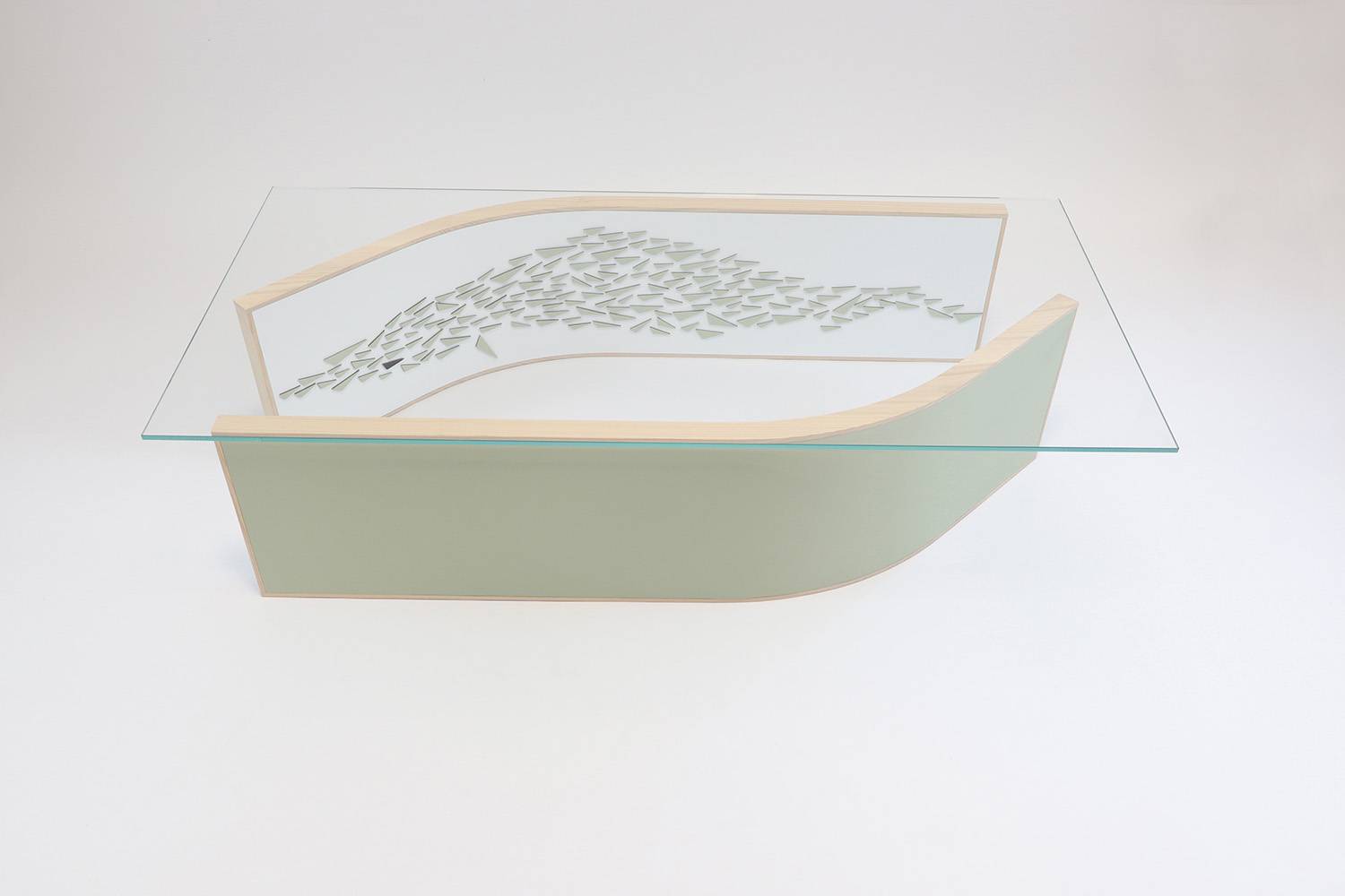 the two elements are made of bent mdf softwood. one side is covered with furniture linoleum, a high-quality and eco-friendly material. there are four colors to choose from. the opposite side is covered with a white iron foil, on which the magnetic pieces of furniture linoleum stick. the edges are made of european ash wood and the tabletop is made of extra transparent 8mm safety glass.