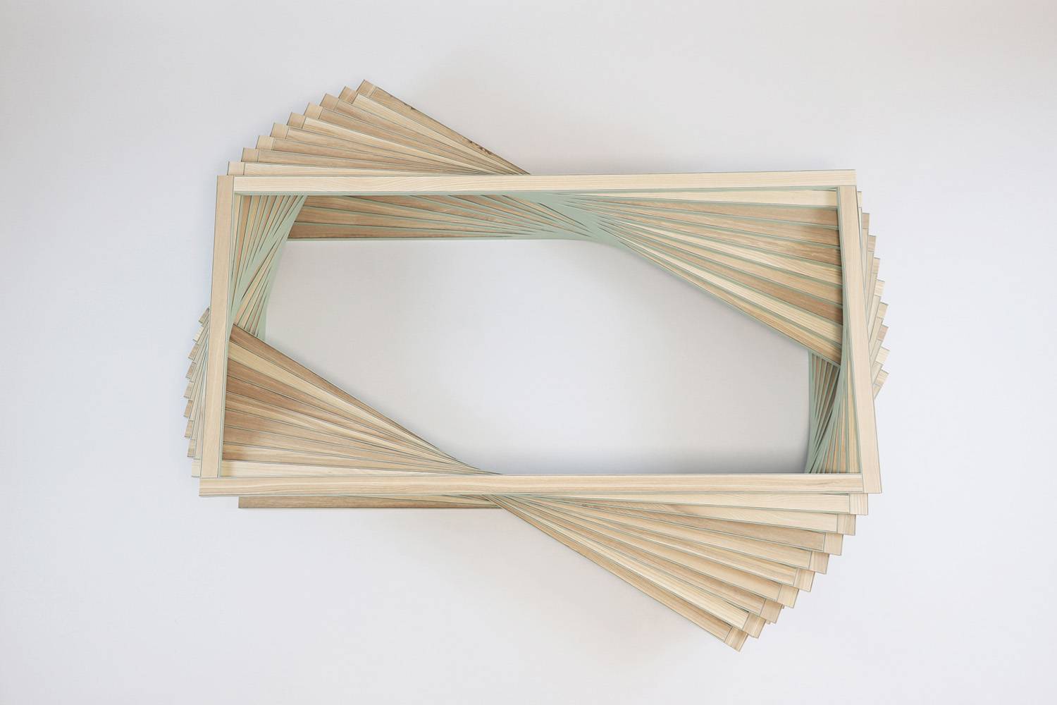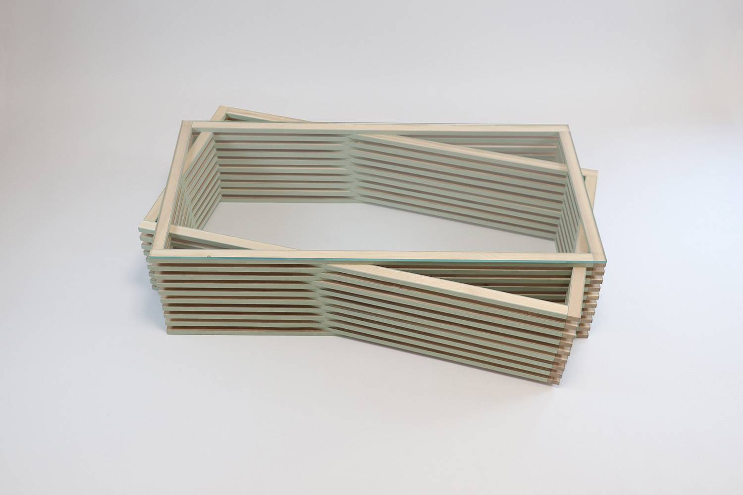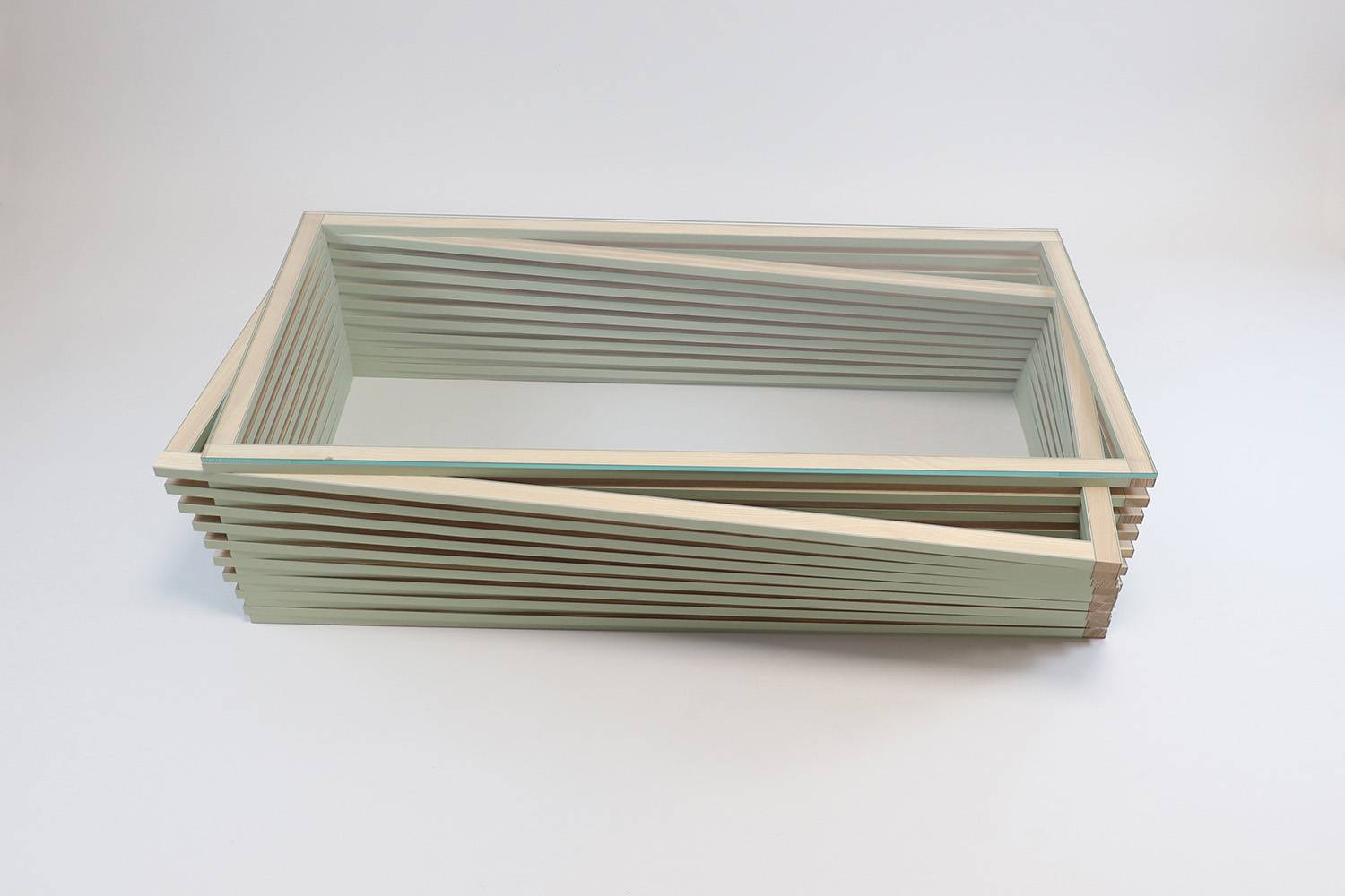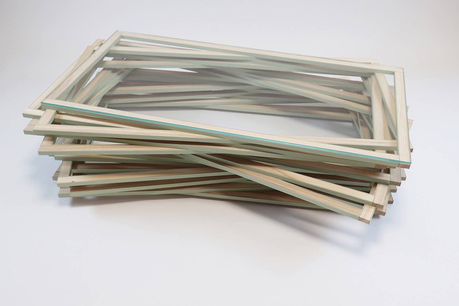 the simpler the product, the more difficult it is to develop. fortunately, we made it. now we can enjoy the 20 frames that can be stacked freely on top of each other and the resulting patterns. the filigree but sturdily doweled frames allow for thousands of forms and even show their curves now and then. admittedly, the arrangement tempts to pedantry. yes, you can also just arrange the frames wildly, but where will that lead?