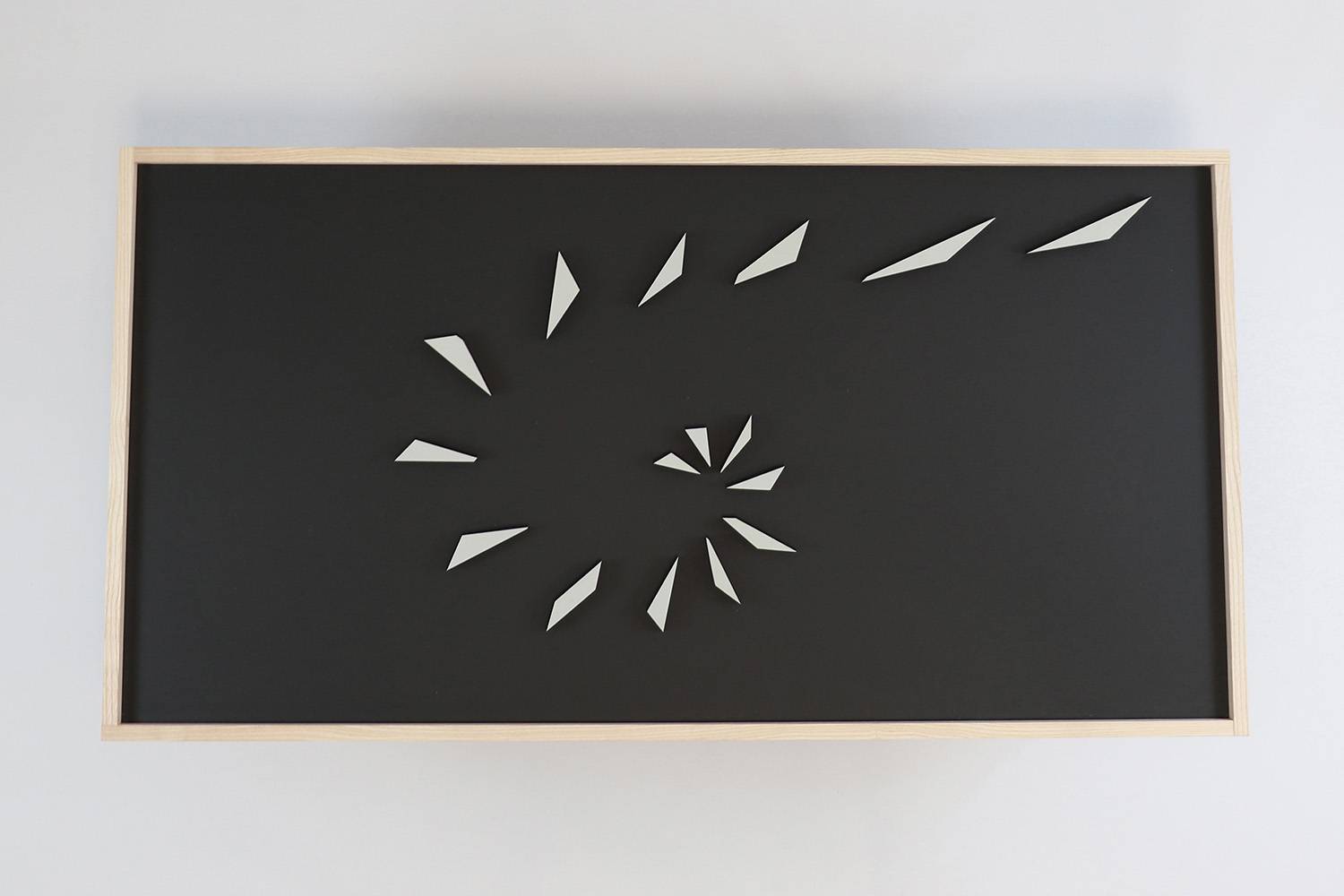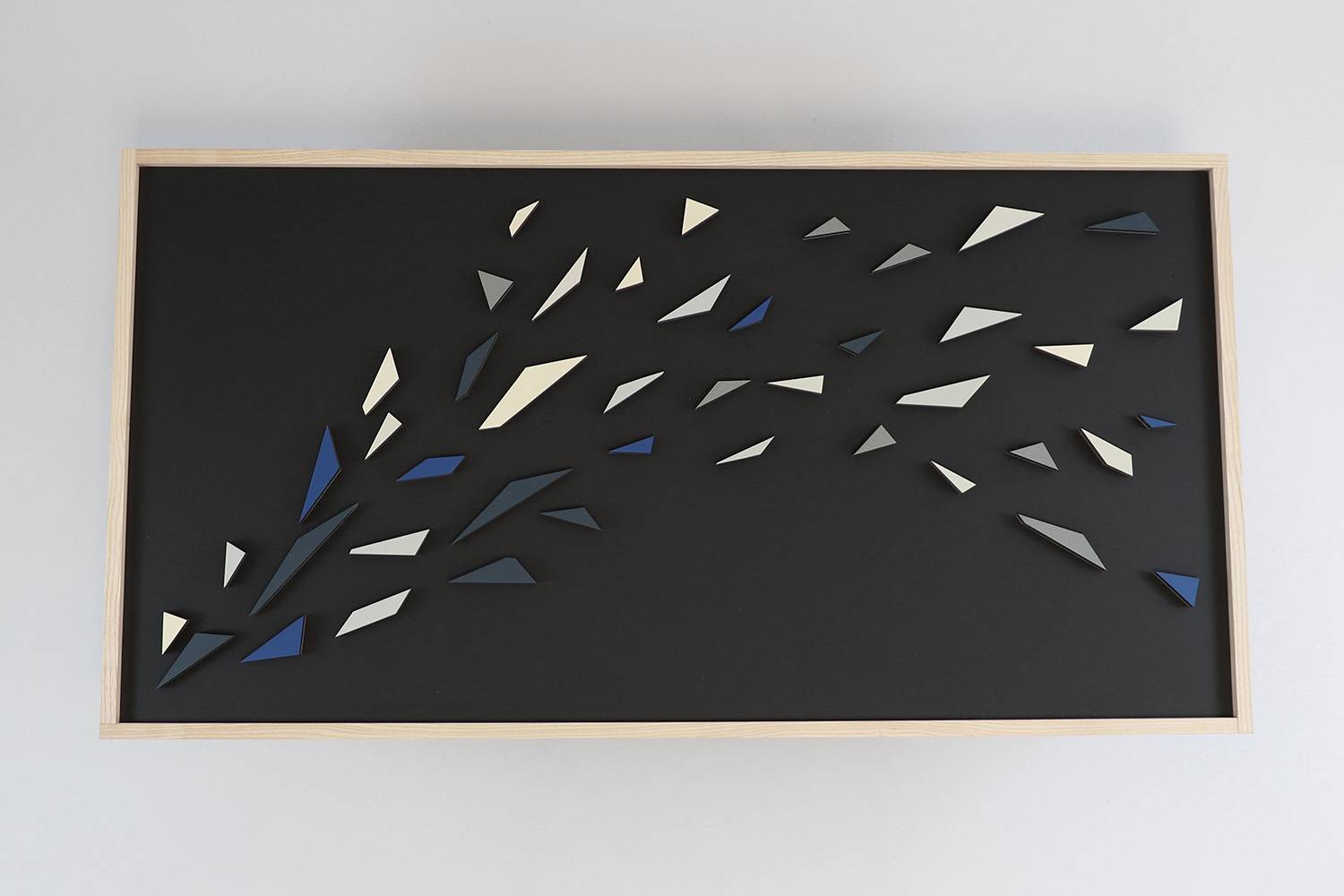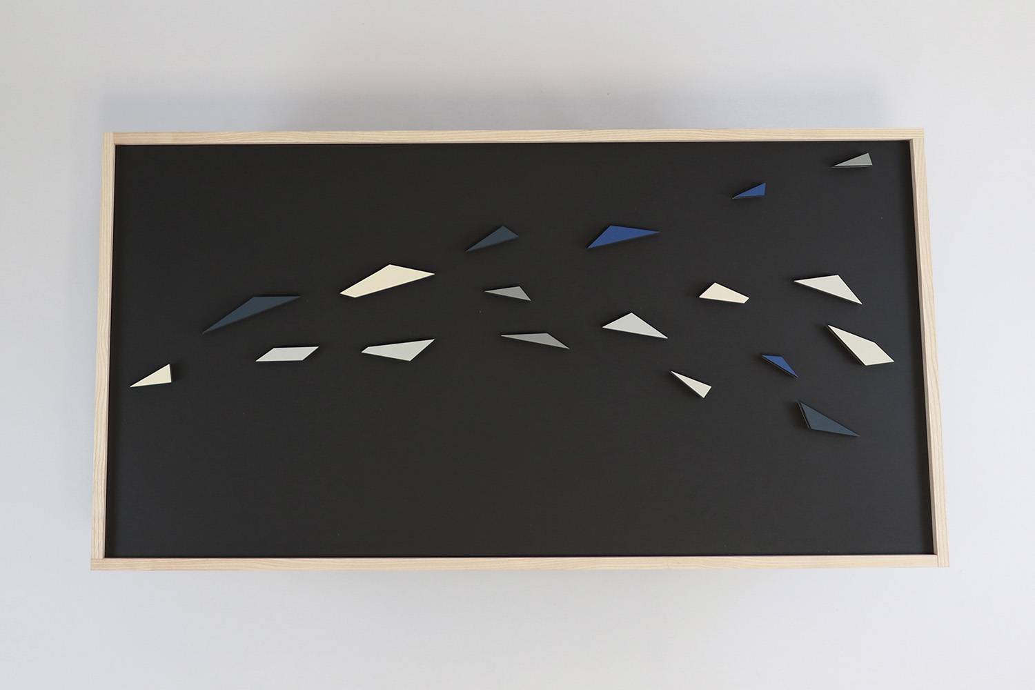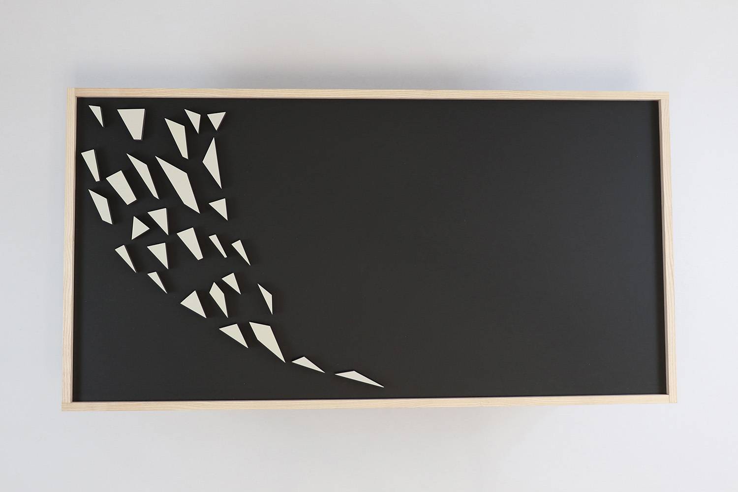 two beautiful waves that can be positioned freely under the glass plate. that’s something. but in addition there are 400 individual and hand-cut … well … triangles, fish, birds, dots, arrows. anyway, these are magnetic and stick to the white background. it’s best not to think about it too long, just get started. it always looks good in the end. but wait! one of the elements has a different color. why is that, i wonder?
