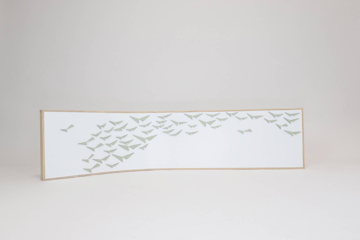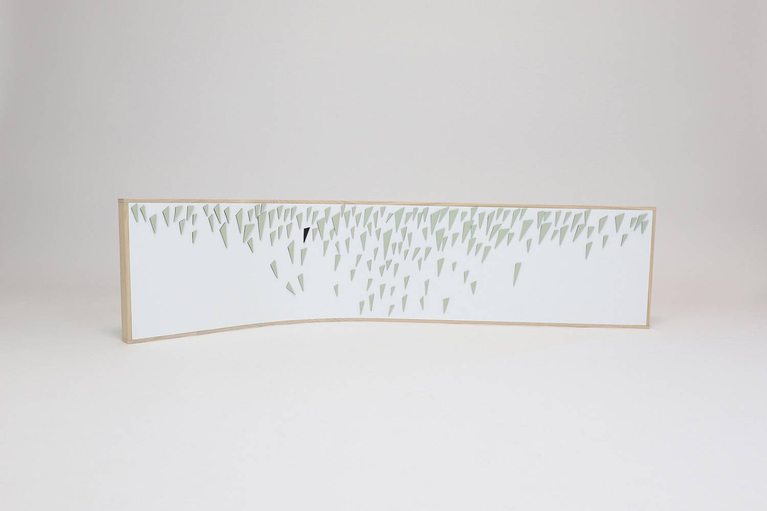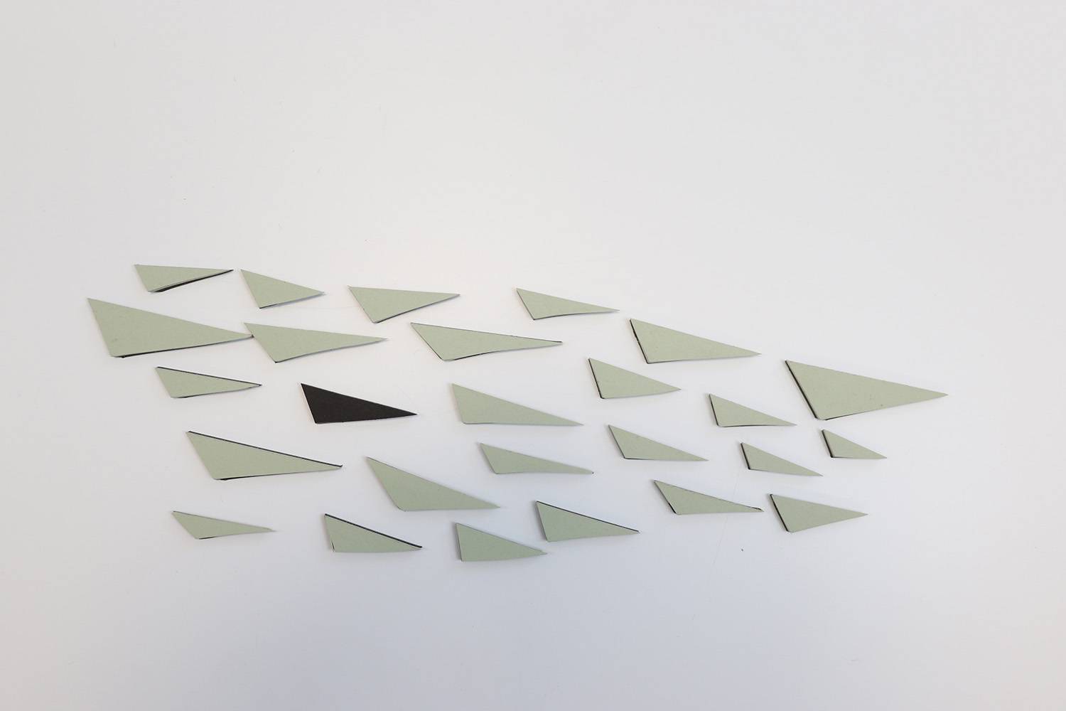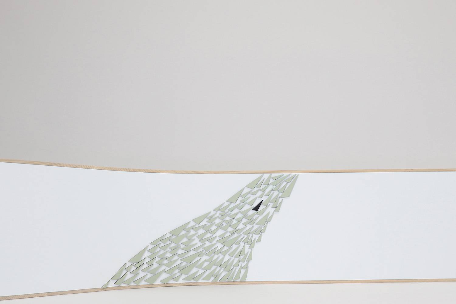 two beautiful waves that can be positioned freely under the glass plate. that’s something. but in addition there are 400 individual and hand-cut … well … triangles, fish, birds, dots, arrows. anyway, these are magnetic and stick to the white background. it’s best not to think about it too long, just get started. it always looks good in the end. but wait! one of the elements has a different color. why is that, i wonder?
