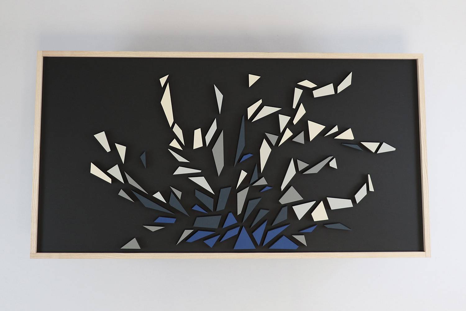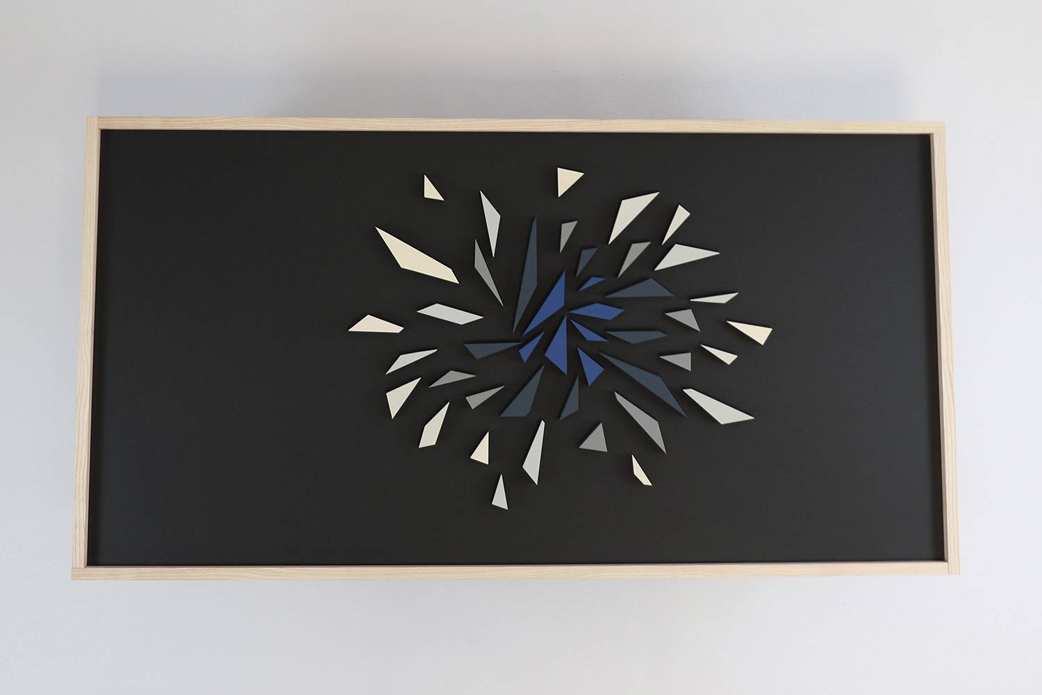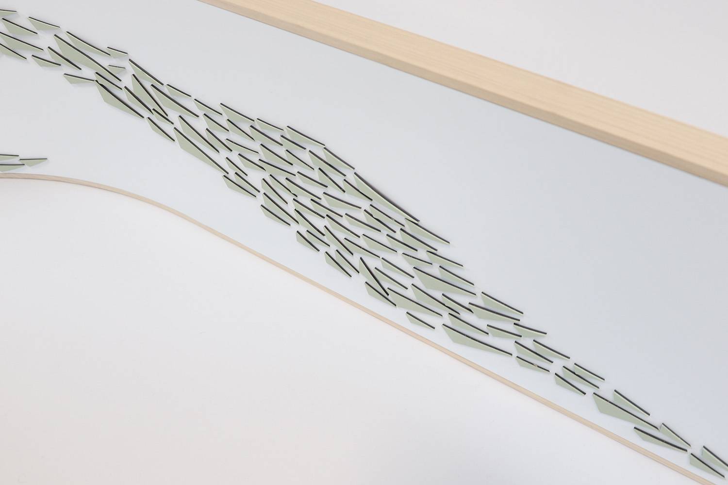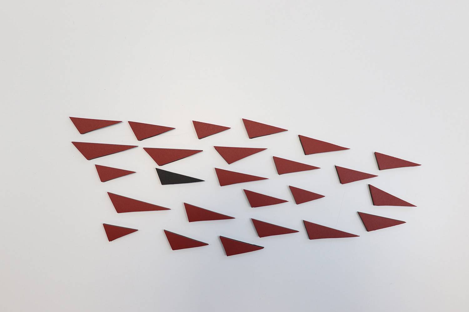 two beautiful waves that can be positioned freely under the glass plate. that’s something. but in addition there are 400 individual and hand-cut … well … triangles, fish, birds, dots, arrows. anyway, these are magnetic and stick to the white background. it’s best not to think about it too long, just get started. it always looks good in the end. but wait! one of the elements has a different color. why is that, i wonder?