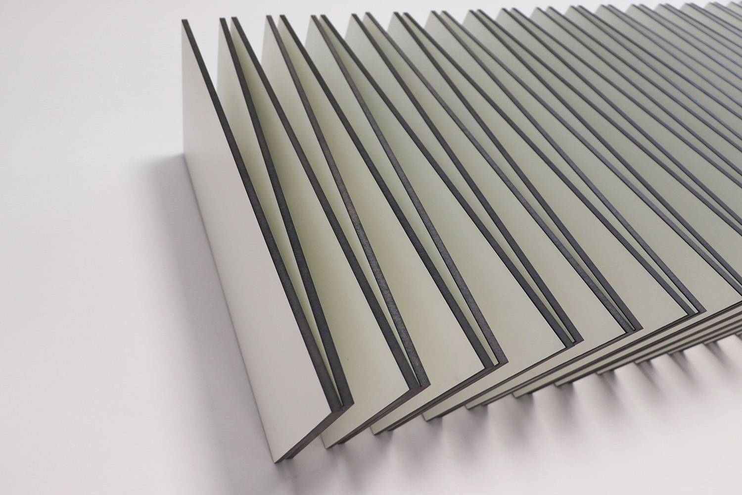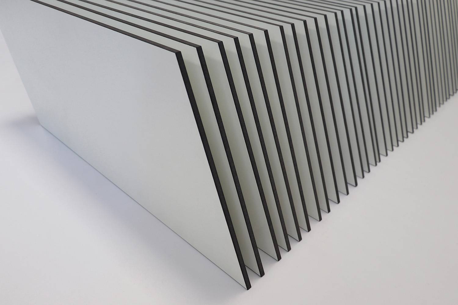 the elements are made of black cdf wood, which is coated white on both sides. the material of swiss origin is high-strength and water resistent. the elements are connected with a steel hinge. the distance between the elements averages 2.4cm, so that even a drinking glass can be put down safely. but since you should never trust advertising texts, there are four matching coasters for expresso lovers included.