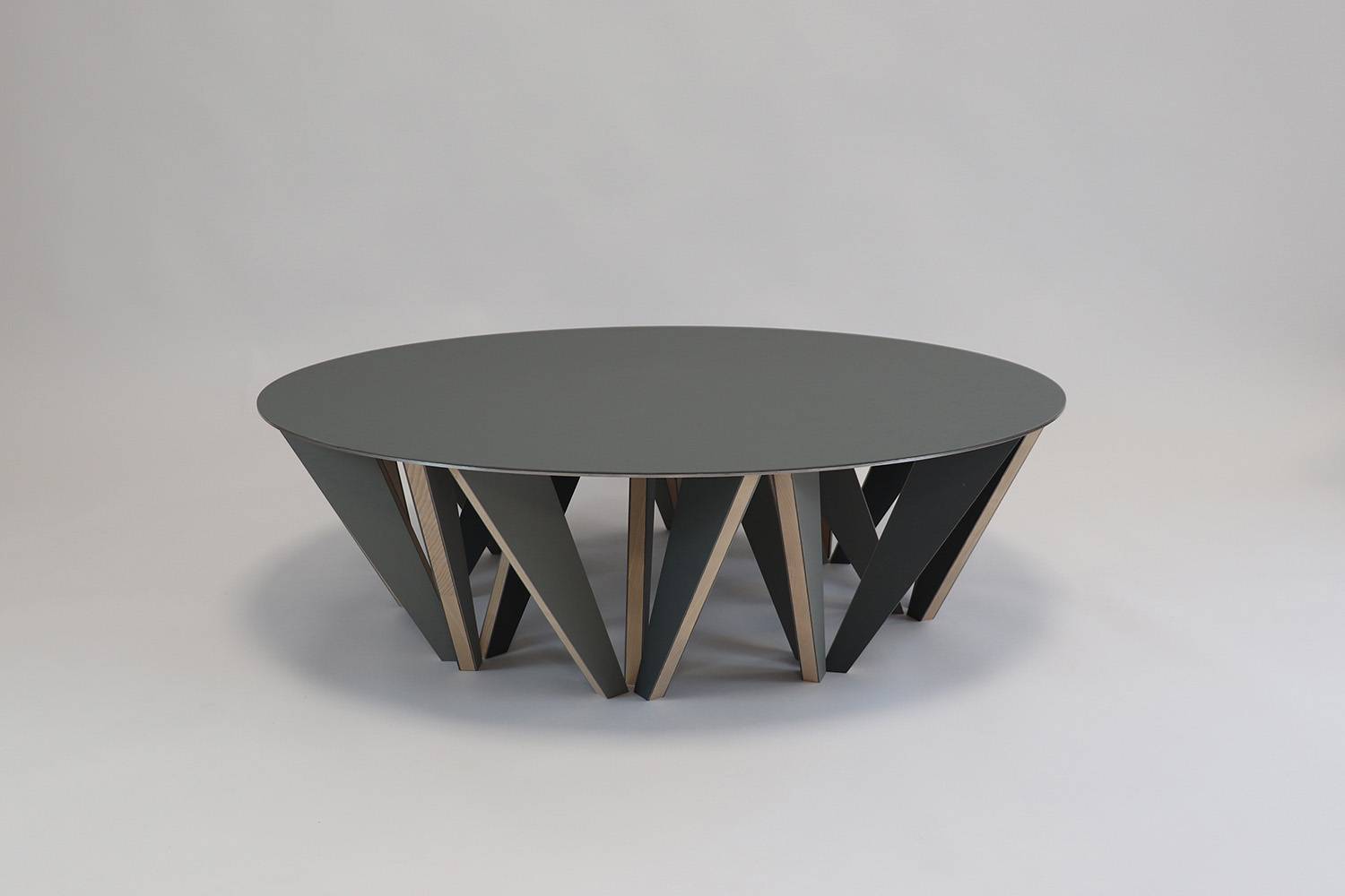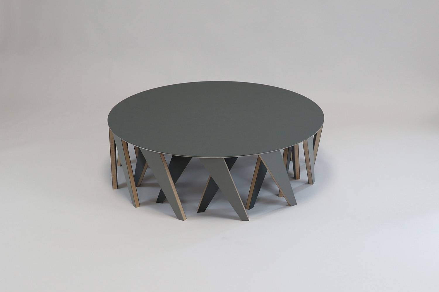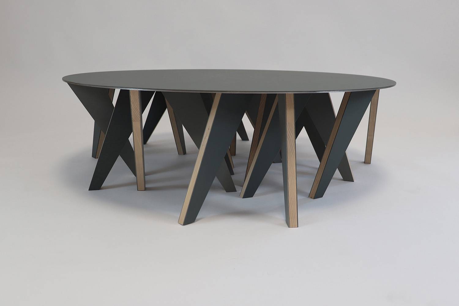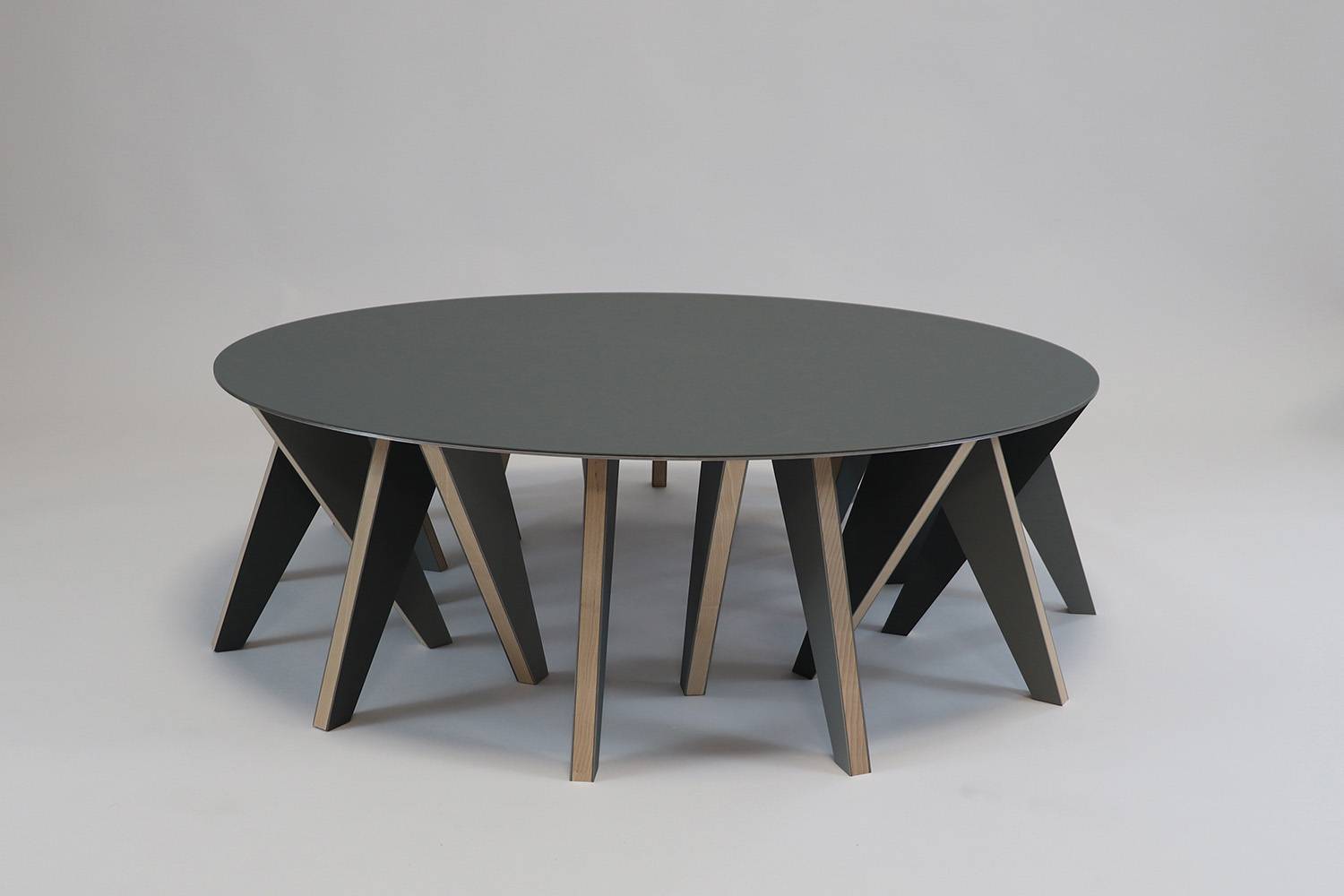 the tabletop is covered with dark grey furniture linoleum. all in all, the tabletop is only 5mm thick and due to the strong magnets and many legs, the table is extremely stable. the furniture linoleum is both soft to the touch and sturdy. renewable raw materials were primarily utilized for its construction. the legs are made of naturally untreated european ash and accentuated in two different shades of grey.