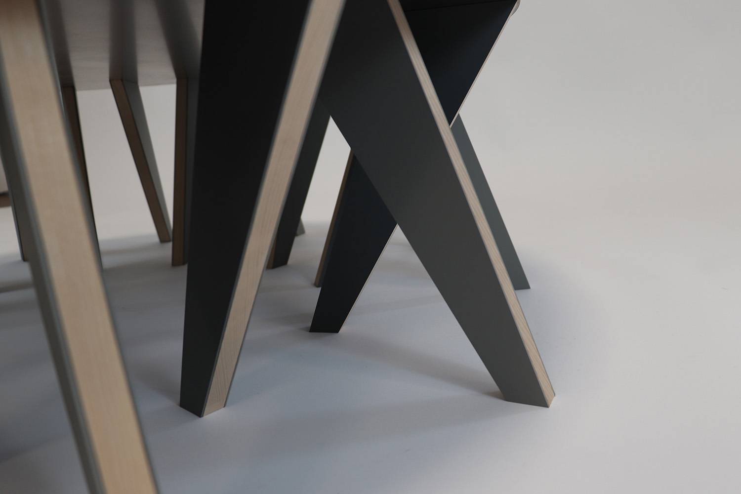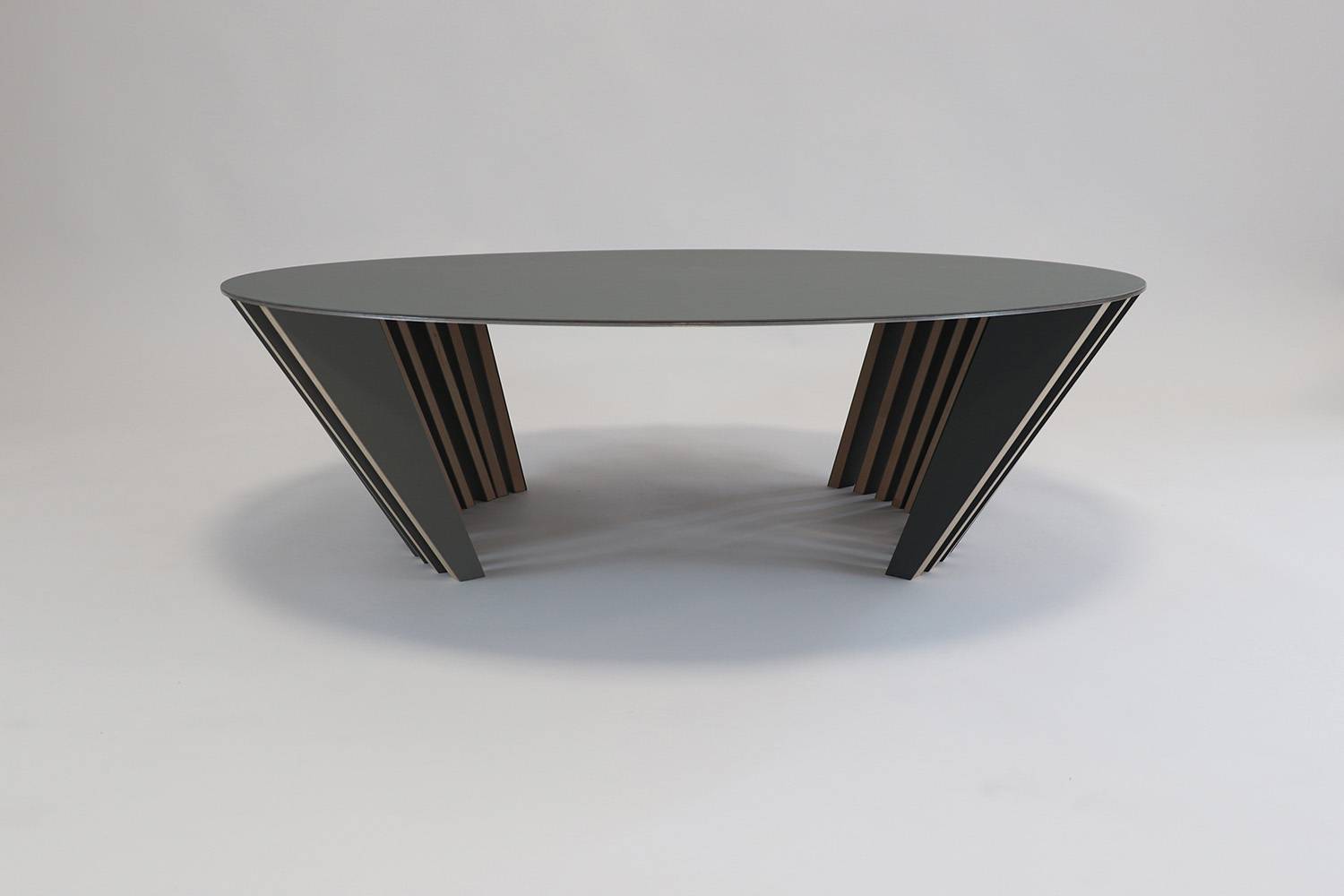 black mdf softwood is covered on both sides with the very excellent furniture linoleum. the natural material with a long history is kept darker on the outside, while the inside surfaces shine out of the shadows. 4 color combinations are available. the opposing triangles are connected with stainless steel rods that give the table a distinctive aesthetic.
