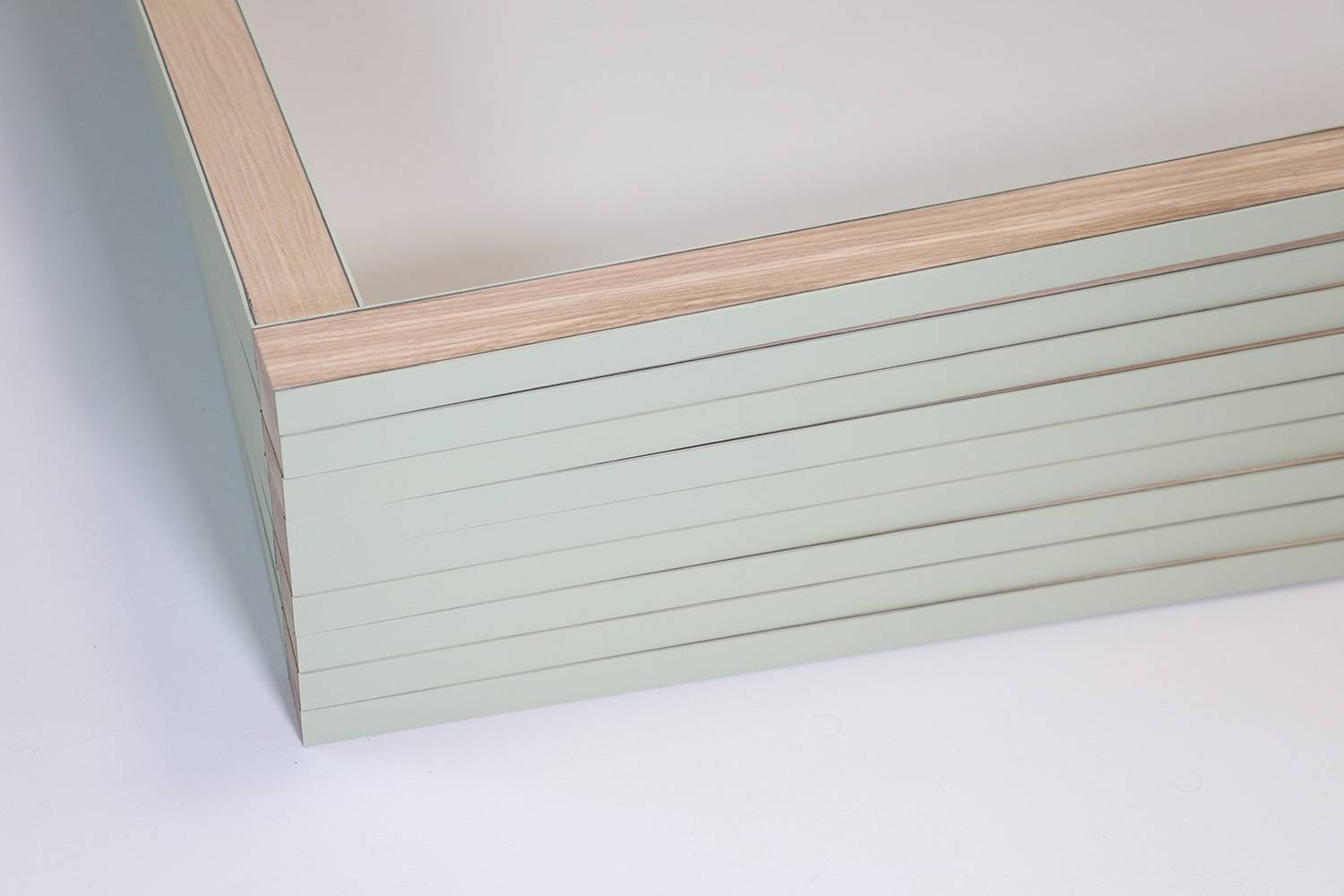 from the bird’s eye view, the wonderful grain of the european ash wood is revealed, while the sides shine in colored furniture linoleum. the ecological material is equally high-quality and is happy to be touched. it doesn’t know fingerprints, dirt or scratches. there are four colors to choose from. the ash, by the way, is naturally untreated.
