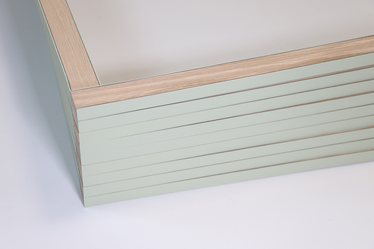 aus der vogelperspektive zeigt sich die wunderbare maserung des europäischen eschenholzes, während die seiten in farbigem linoleum erstrahlen. der ökologische werkstoff ist gleichermaßen hochwertig und freut sich über berührungen. fingerabdrücke, verschmutzungen oder kratzer kennt er nicht. vier farben stehen zur auswahl. die esche ist übrigens naturbelassen: wer gern rotwein über sein mobiliar gießt, sollte lieber woanders kaufen.