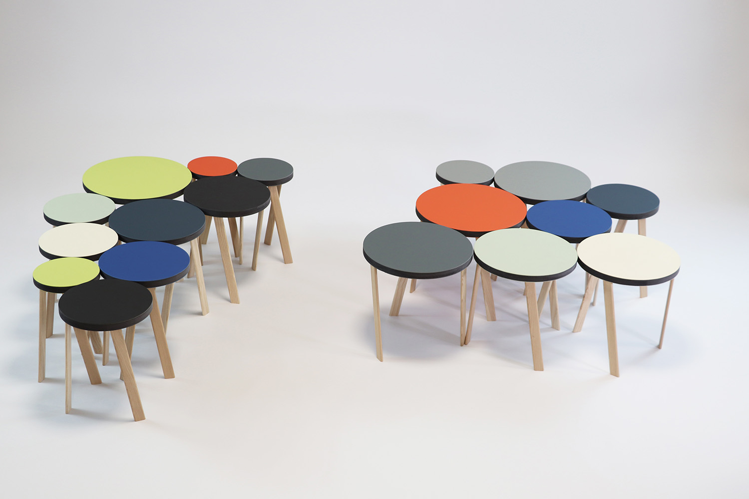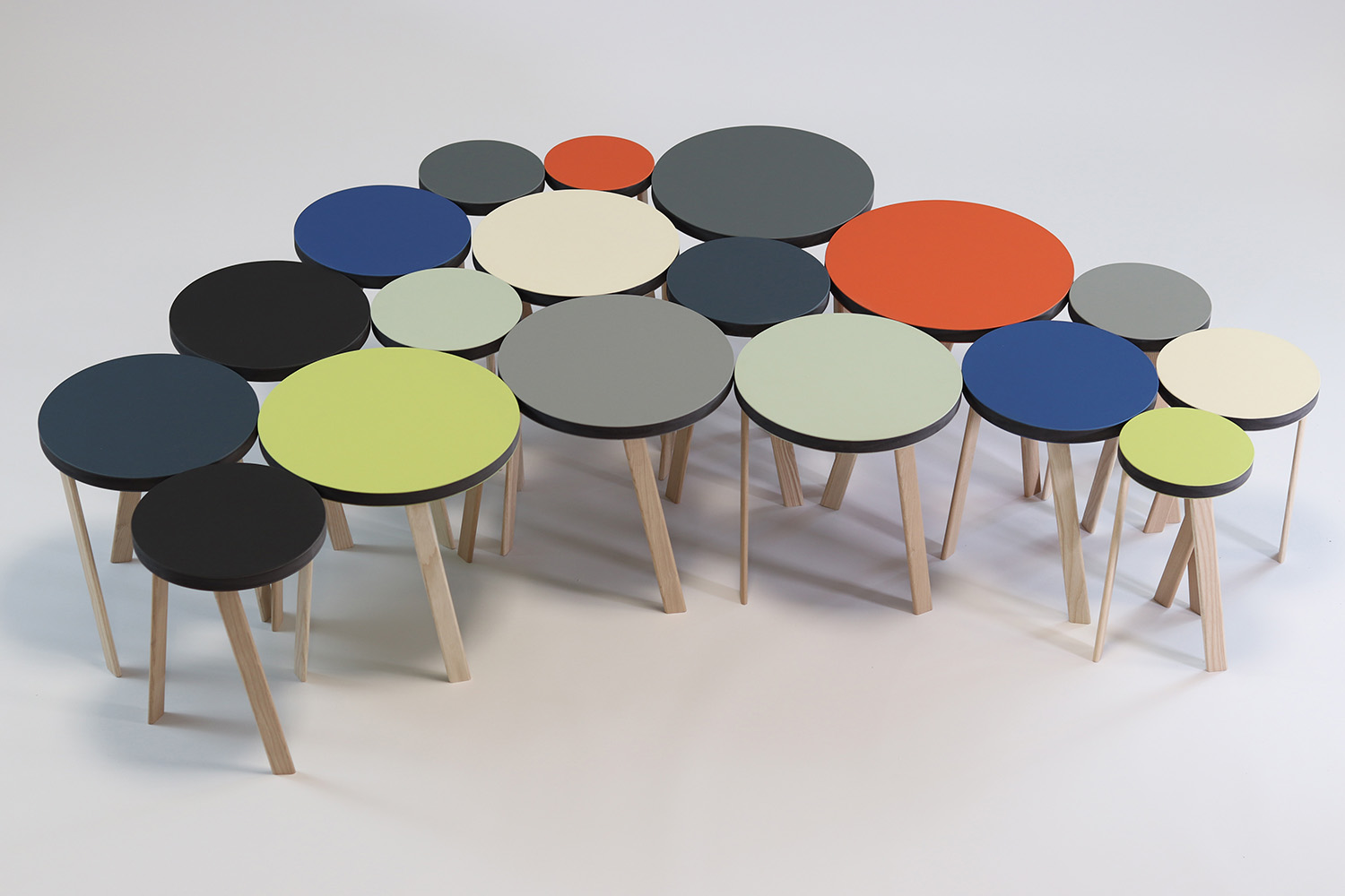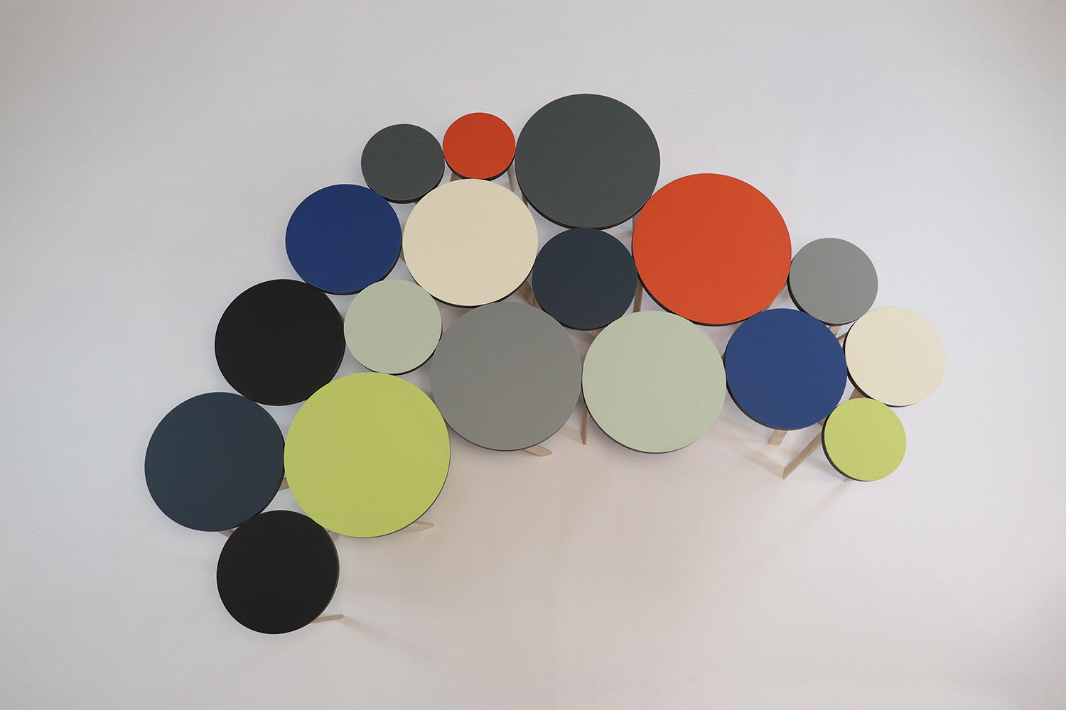 die 18 einzelnen elemente sind aus schwarzem mdf softwood gefertigt und beidseitig mit möbellinoleum, einem natürlichen werkstoff mit langer geschichte, in insgesamt 9 farben belegt. das kleinste element ist 15cm im durchmesser, die übrigen werden immer einen Zentimeter größer. die beine sind aus europäischer esche gefertigt und naturbelassen.